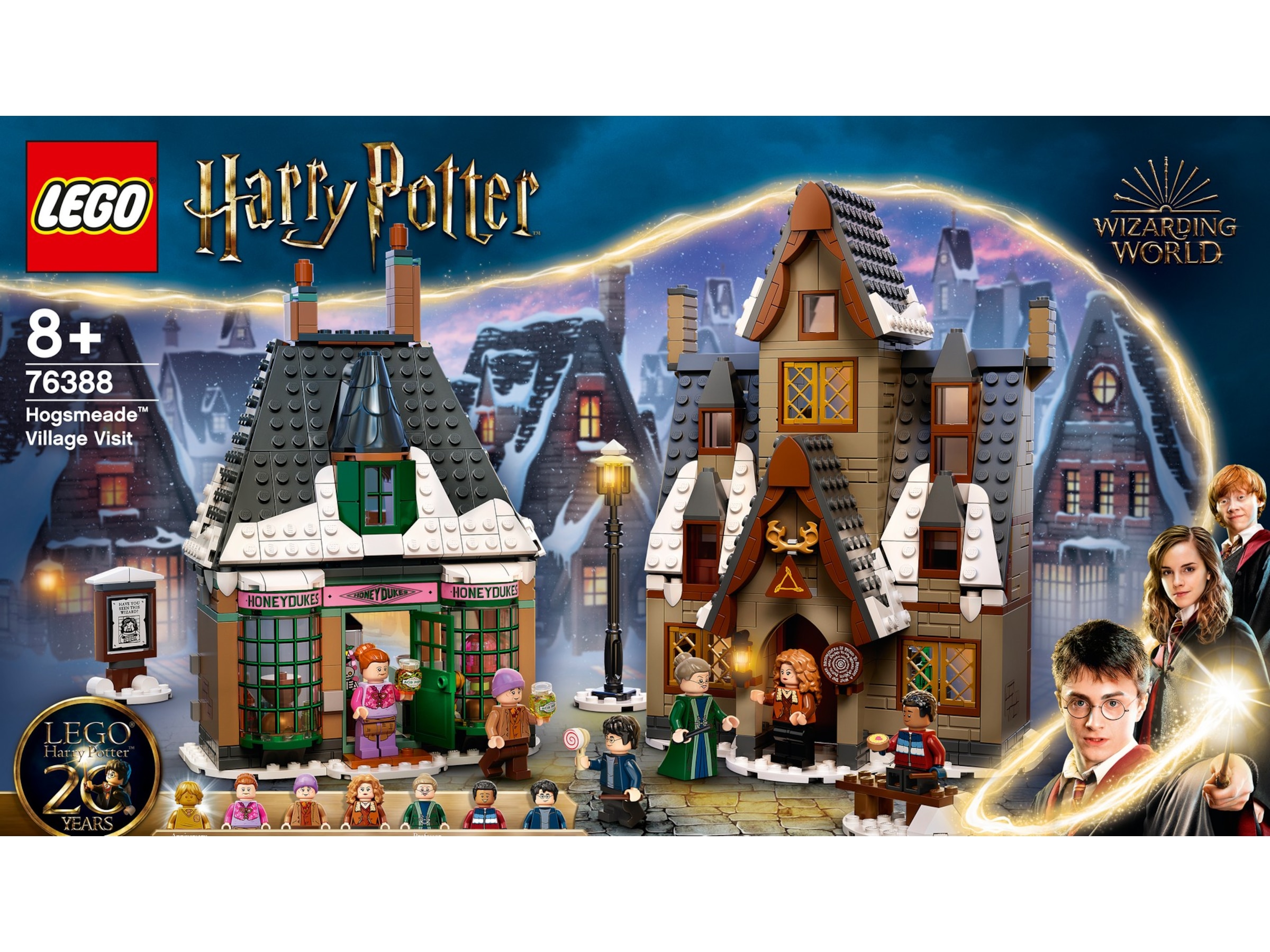 Barn kan utforska oändliga lekmöjligheter och visa upp sin passion för Harry Potter så att alla kan se. Ikoniska byggnader fullspäckade med autentiska detaljer Den snötäckta byn Hogsmeade är ett mycket detaljerat bygg- och uppvisningsset som innehåller 6 minifigurer – Harry Potter, Dean Thomas, professor McGonagall™, madam Rosmerta, herr och fru Flume – plus massor av coola funktioner, möbler och tillbehör som inspirerar barn att återskapa filmscener eller hitta på egna äventyr. Det finns en byggbar 2-våningsversion av godisaffären Godisbaronen och puben Tre kvastar, med massor av engagerande lekmöjligheter på fram- och baksidan. 3 mindre byggen ger mer inspiration till fantasifulla lekar. Setet innehåller också extra samlartillbehör: en exklusiv gyllene jubileumsminifigur av Ron Weasley™ och 4 slumpmässiga samlarplattor med trollkarlskort!