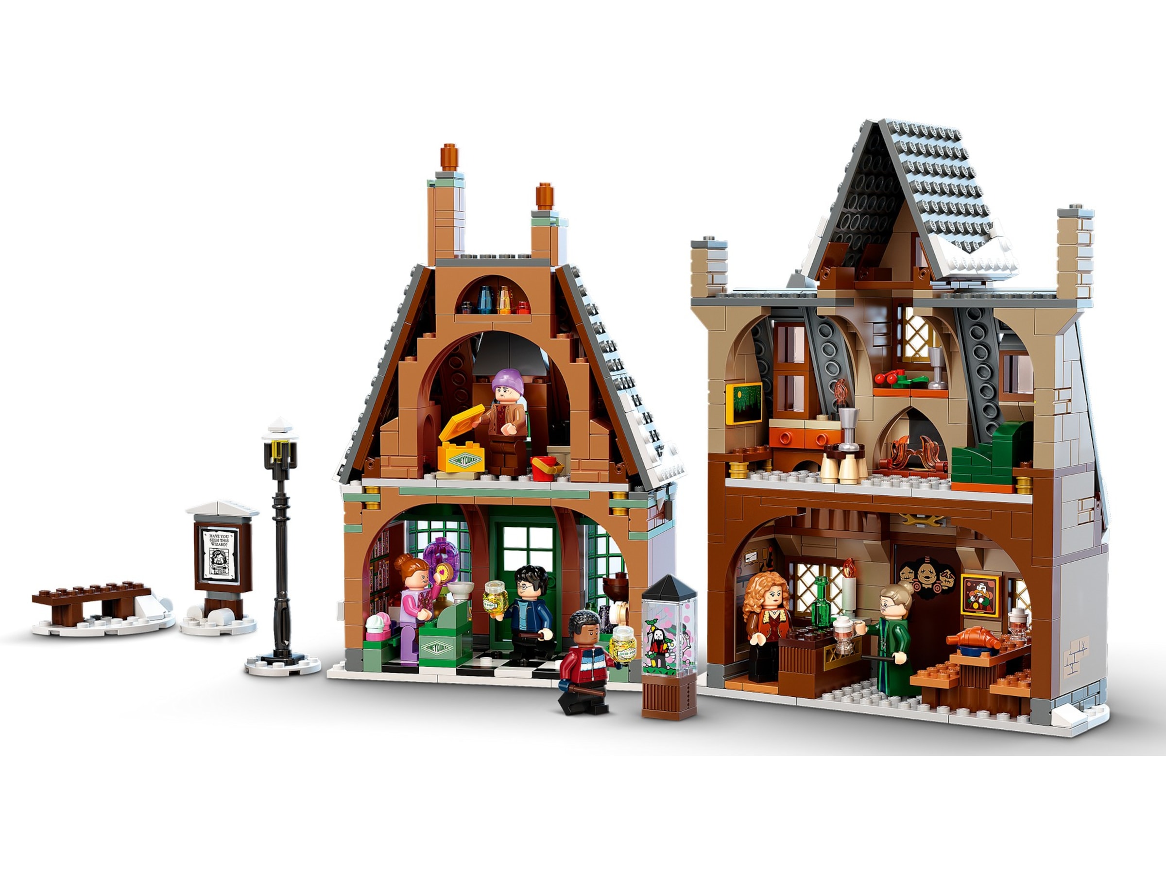 - 3 mindre byggen ger mer inspiration till fantasifulla lekar: en gatlykta, en bänk med snö och en anslagstavla med 2 sidor med en affisch med den efterlysta Sirius Black™.