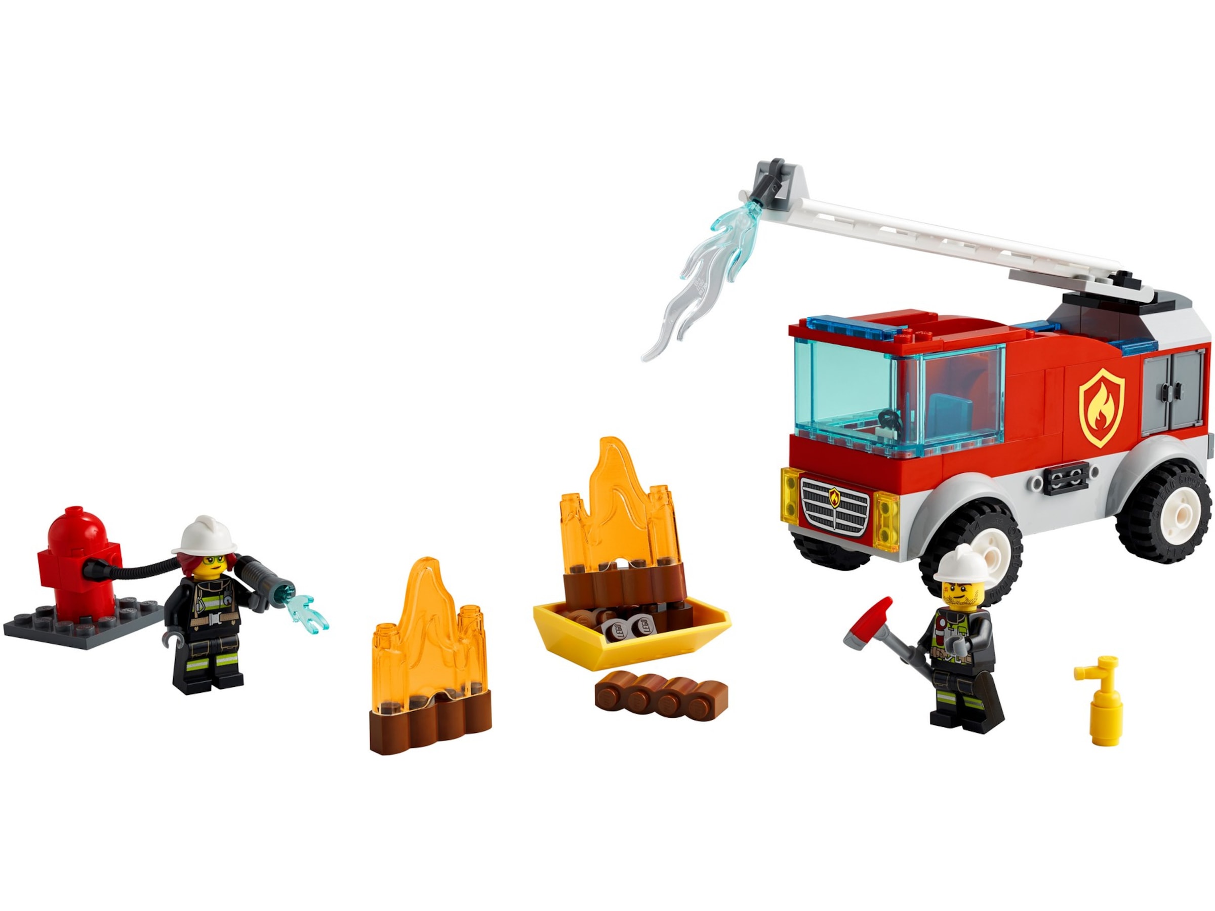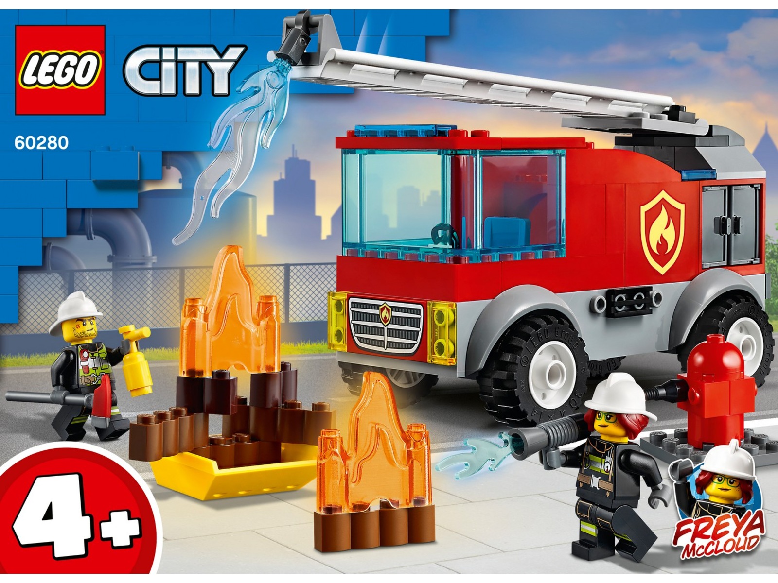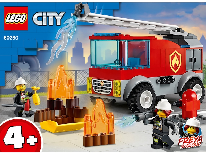 - Vad finns i lådan? Det finns en leksaksbrandbil med stege och släckare, en brandpost och stapelbara LEGO® flammor, plus minifigurerna brandman och brandchefen Freya McCloud från LEGO City tv-serien.