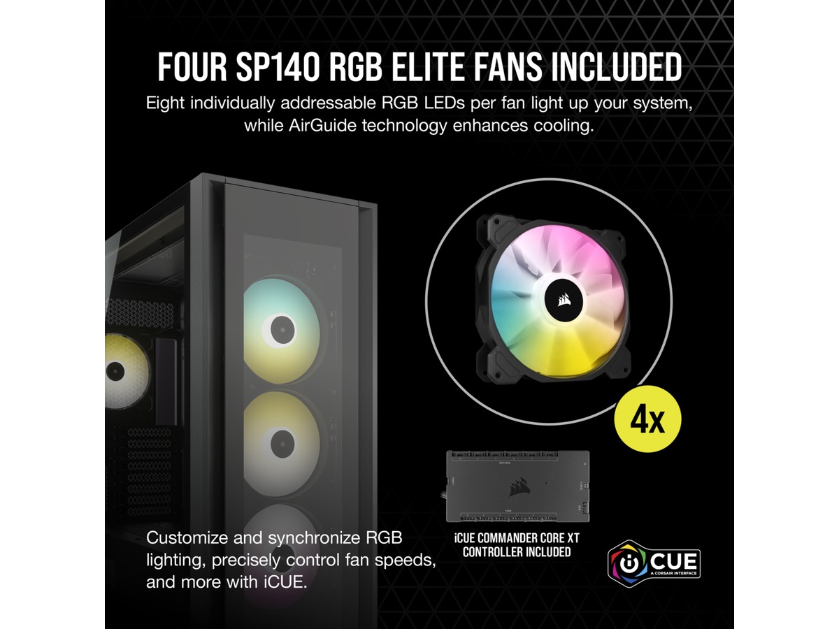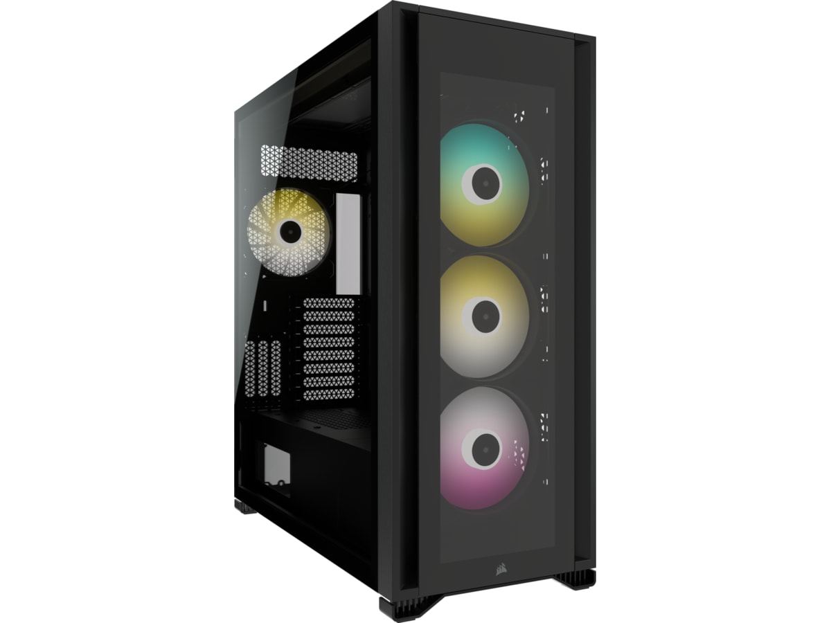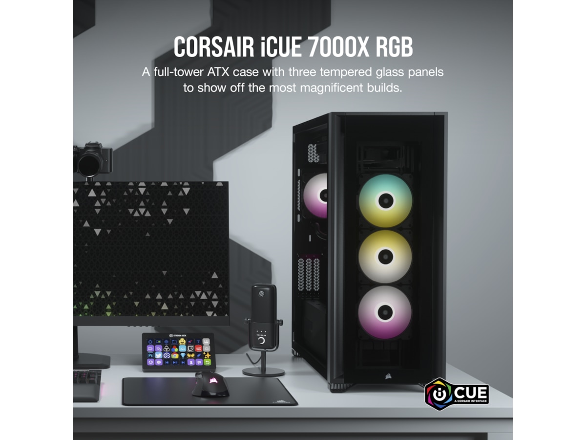 CORSAIR iCUE 7000X RGB full-tower ATX-hölje visar din konstruktion bakom tre härdade glaspaneler, med plats för upp till tre simultana 360 mm-radiatorer, dold kabelhantering och fyra medföljande CORSAIR SP140 RGB ELITE-fläktar.