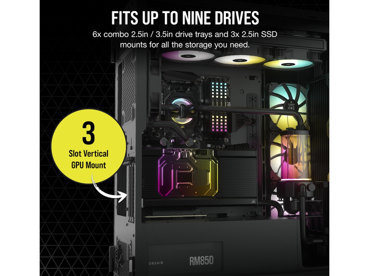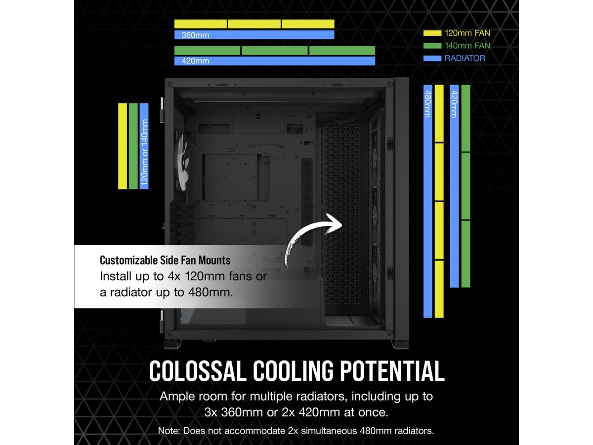 Upp till tre simultana 360 mm-radiatorer (tak, sida, front), två simultana 420 mm-radiatorer (tak, front), eller till och med en 480 mm radiator (sida) betyder att du kan designa din drömslinga.