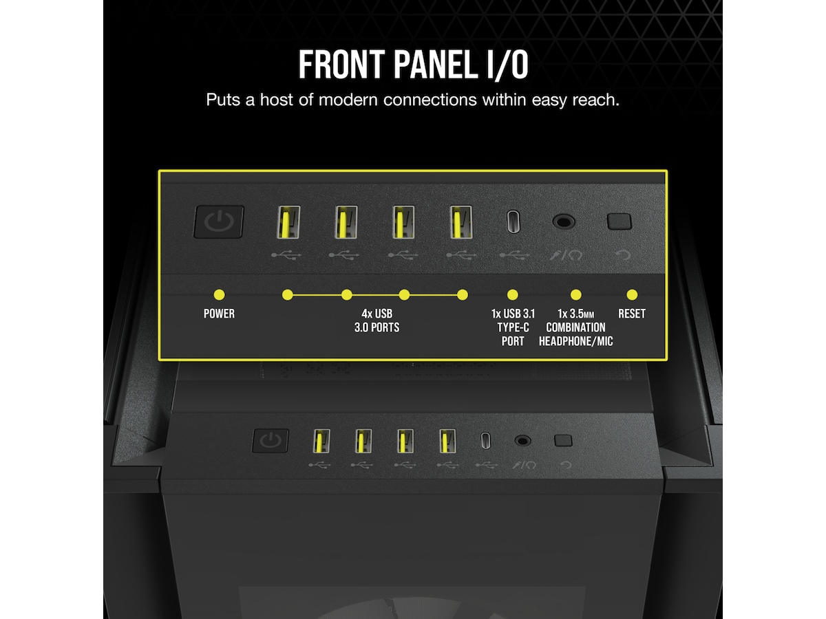 Placerar dina anslutningar inom bekvämt räckhåll, och har en USB 3.1 Type-C-port, 4x USB 3.0-port och en kombination av ljud-/mikrofonuttag.