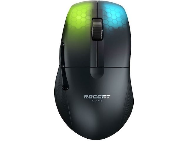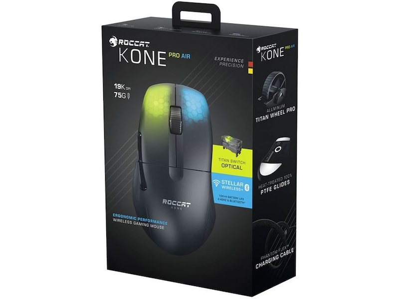 Möt den trådlösa spelmusen ROCCAT® Kone Pro Air Ergonomic Optical Performance med RGB-belysning, den första trådlösa Kone någonsin. Perfekt design efter 14 års hantverk och med bara 75 g är Kone Pro Air lätt, bekväm och avancerad. Den använder sig av Titan Switch Optical, AIMO RGB-belysning, vår egen 19K DPI Owl-Eye-sensor, USB-C PhantomFlex™ laddningskabel och värmebehandlade glides.