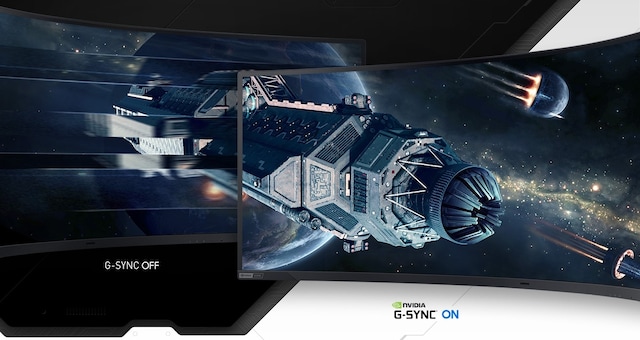 Kompromisslös action. G-Sync synkroniserar grafikkortet med skärmen för att eliminera hackig grafik, eftersläpningar och andra grafikstörningar. Snabba och komplexa spelscener återges stabilt utan störningar med AMD FreeSync Premium Pro.