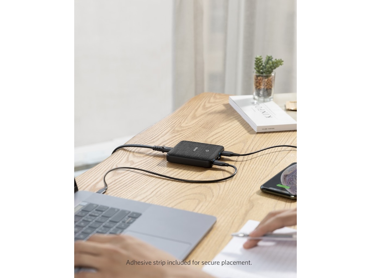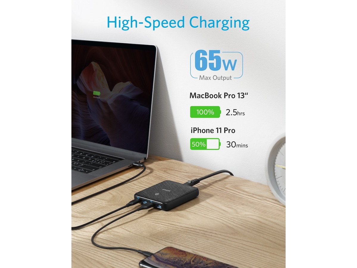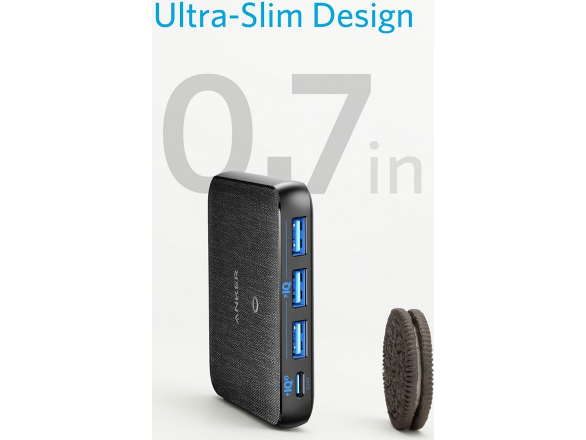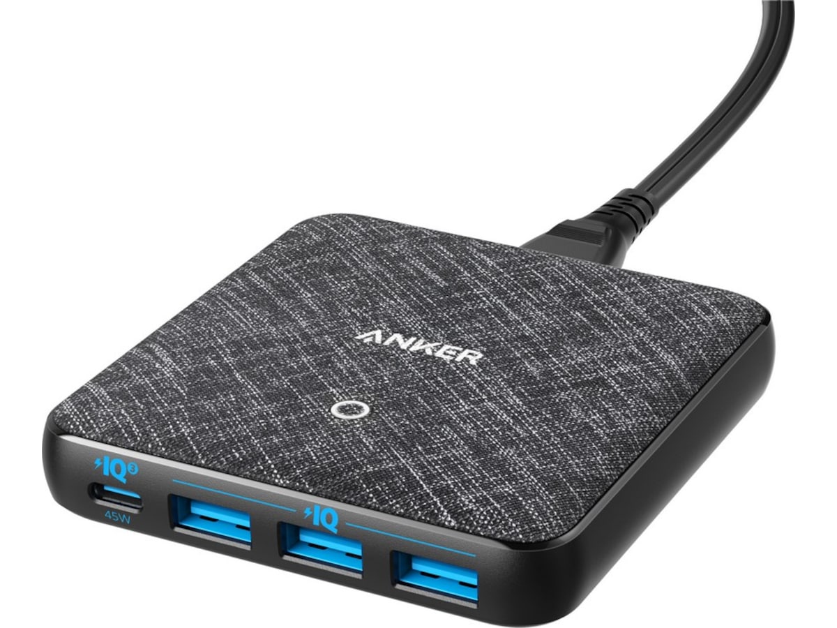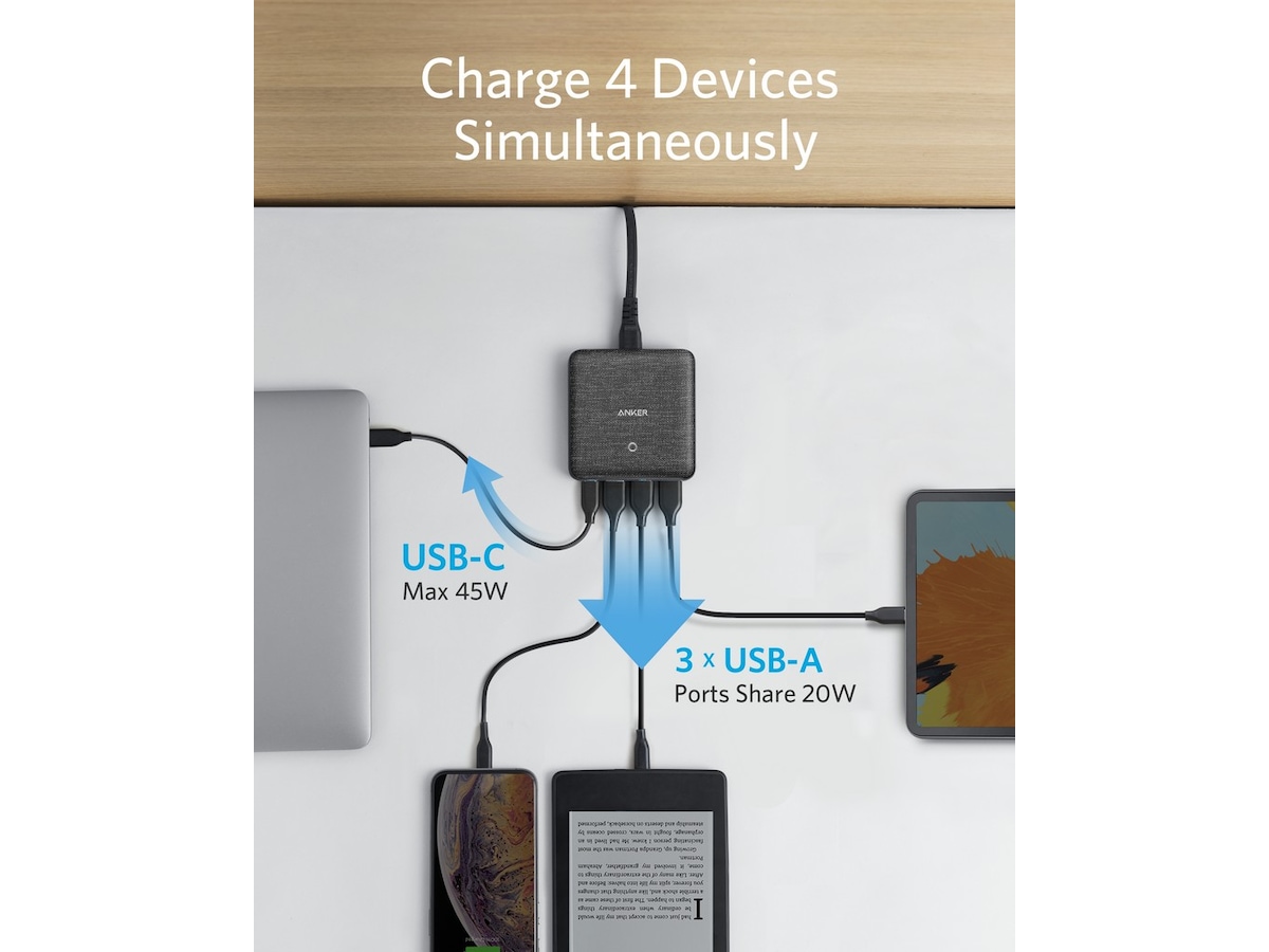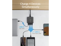 Anker PowerPort Atom III laddningsstation Kan ladda 4 enheter samtidigt En PowerIQ 3.0-aktiverad USB-C-port ger en maximal uteffekt på 45 W, medan 3 USB-portar delar på totalt 20 W.
