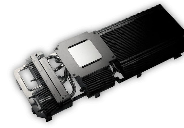 Värmespridaren drar upp värmen till heatpipes som transporterar den genom en lamellstack som fyller större delen av kortets stora 2,7 slitsar.