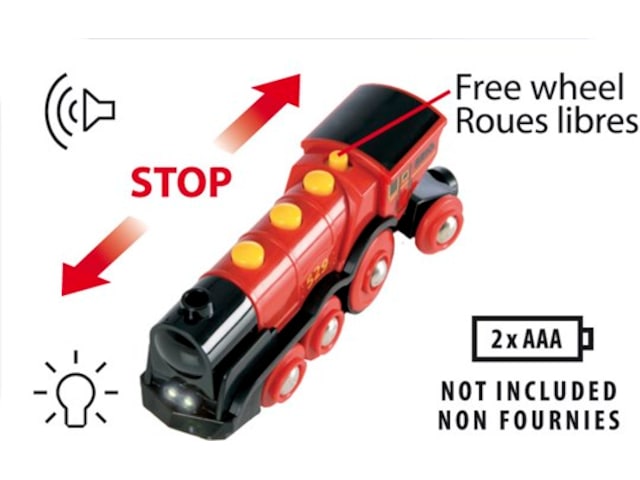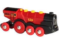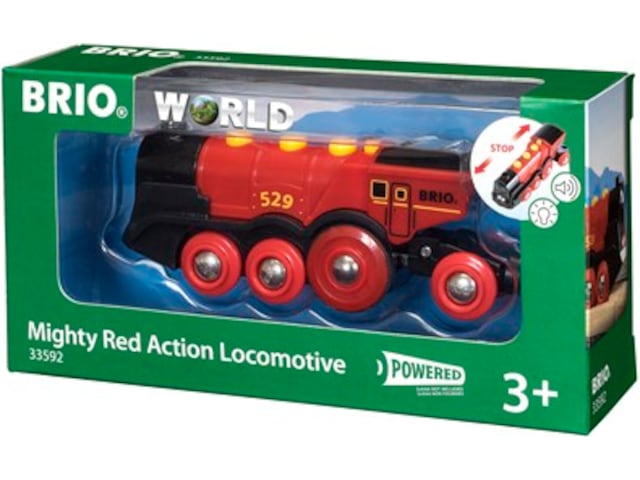 BRIO® Lok stort rött Håll kommande lokförare sysselsatta! Det stora batteridrivna loket har två strålkastare och manuella knappar för "full fart framåt", back och det karakteristiska "tuff-tuff"-ljudet.