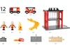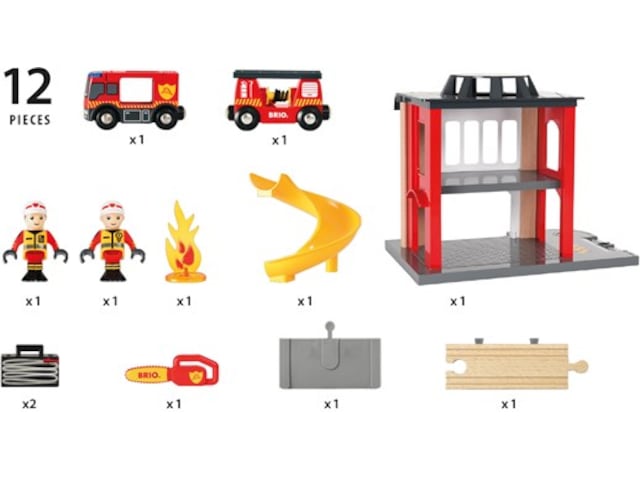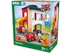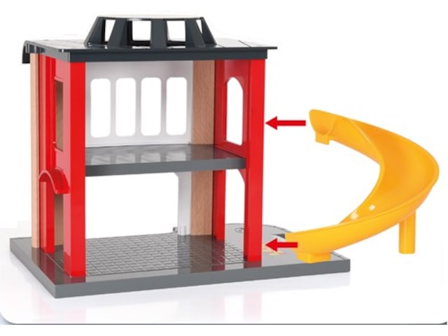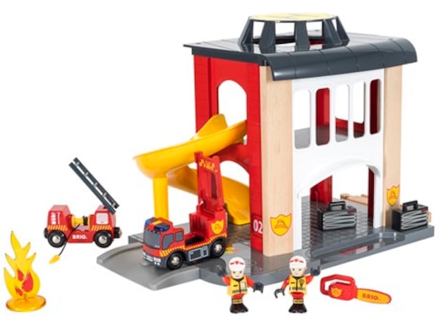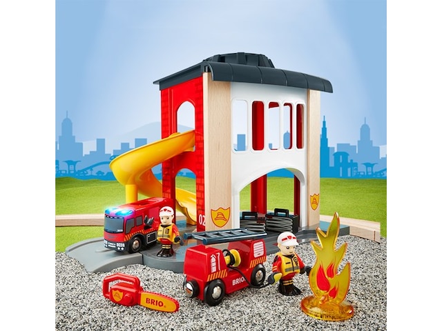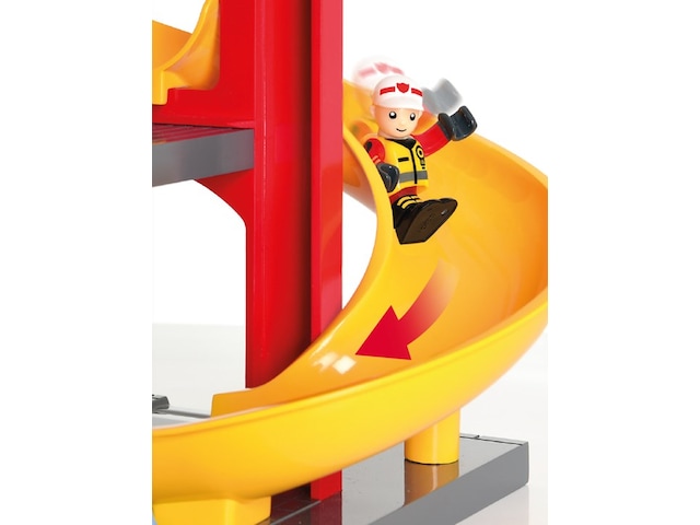BRIO® Huvudbrandstation På brandstationen ska man vara redo att rycka ut. När larmet går åker man i rutschkanan ner till brandbilen som är redo att rycka ut med sirener och allt.