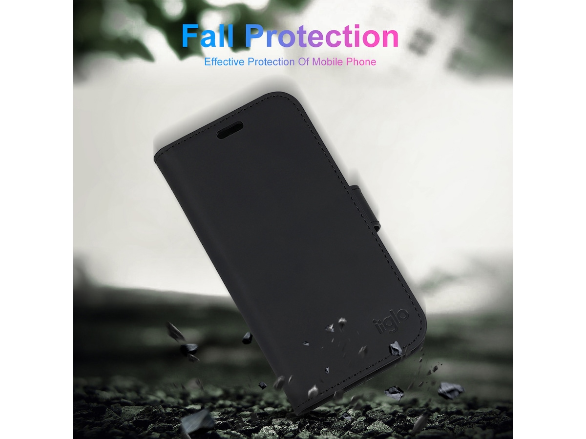Skydda din iPhone med ett iiglo iPhone-plånboksfodral i svart. Fodralet är tillverkat av premium PU-läder som är ett mjukt och slitstarkt material. Fodralet skyddar mot stötar och repor. Magnetfunktionen säkerställer att fodralet hålls stängt, även när telefonen ligger i jackfickan eller PC-fodralet.