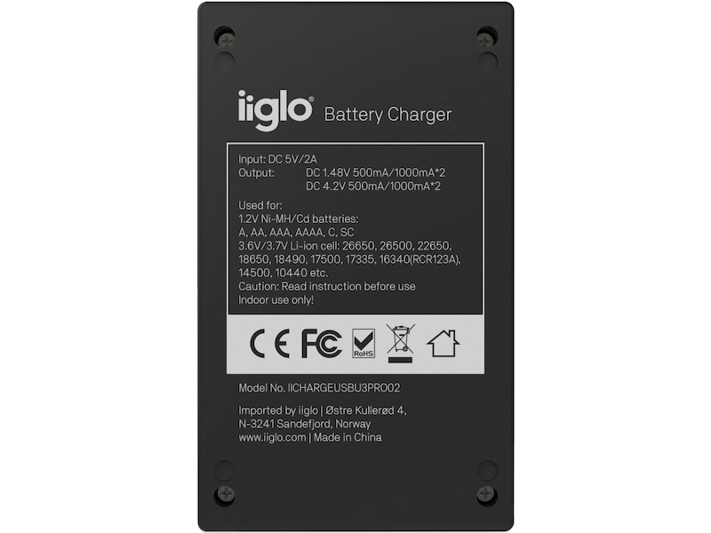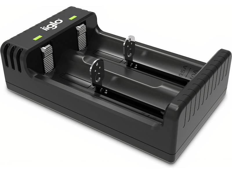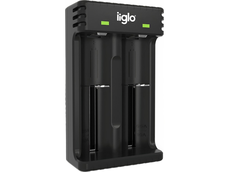 iiglos praktiska USB-batteriladdare kan ladda 2 batterier samtidigt, oavsett om de är litiumjon (Li-Ion), nickel-metallhydrid (Ni-MH) eller nickel-kadmium (Ni-Cd) batterier. Med den medföljande Micro-USB-kabeln kan du ladda batterierna med valfri USB 5V-utgång, till exempel väggladdare, powerbank och billaddare. LED-indikatorerna på laddaren blir gröna när batterierna är fulladdade.