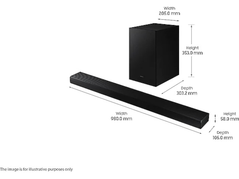 Dimensioner (BxDxH)/vikt Soundbar: 98 cm x 10.5 cm x 5.8 cm / 3.1 kg, Subwoofer: 20.5 cm x 30.32 cm x 35.3 cm / 5.8 kg