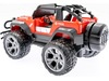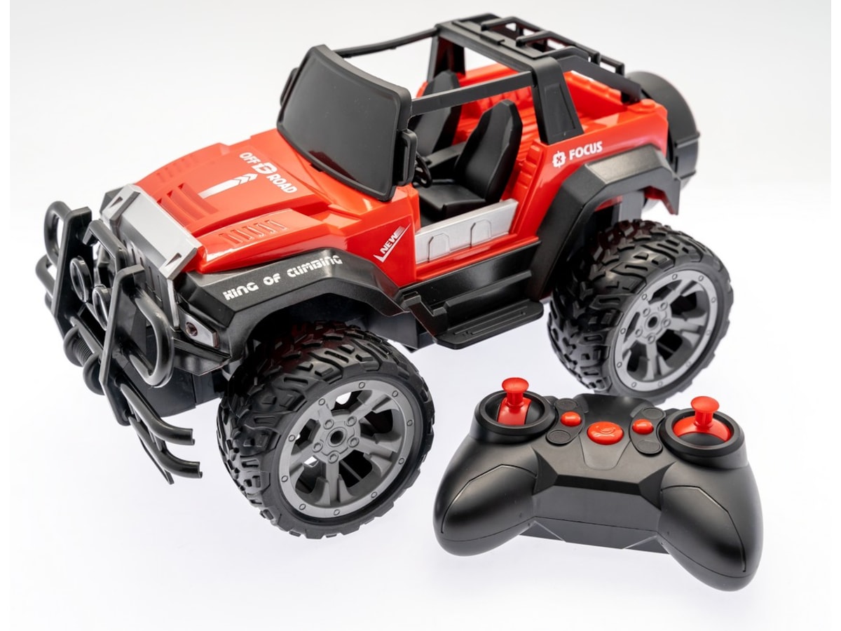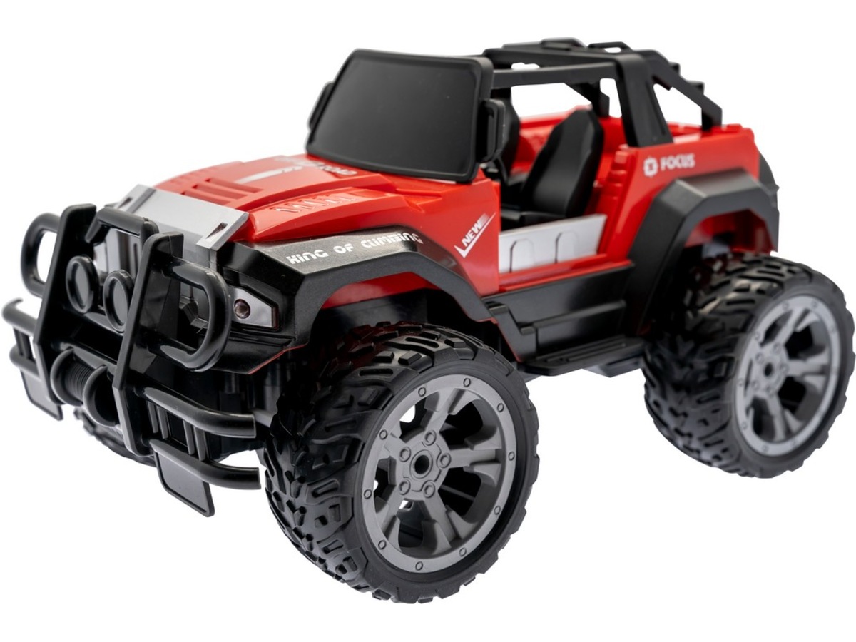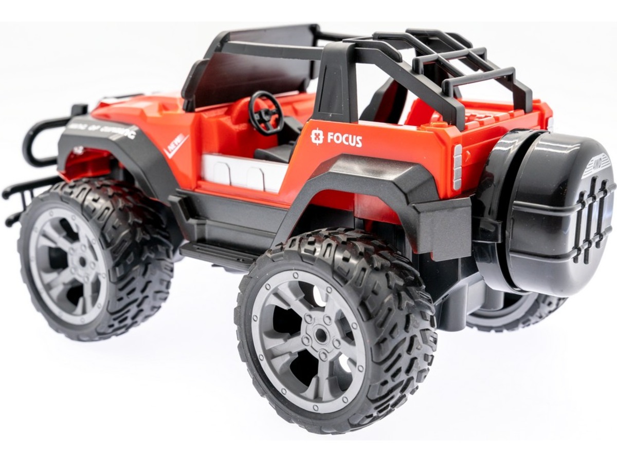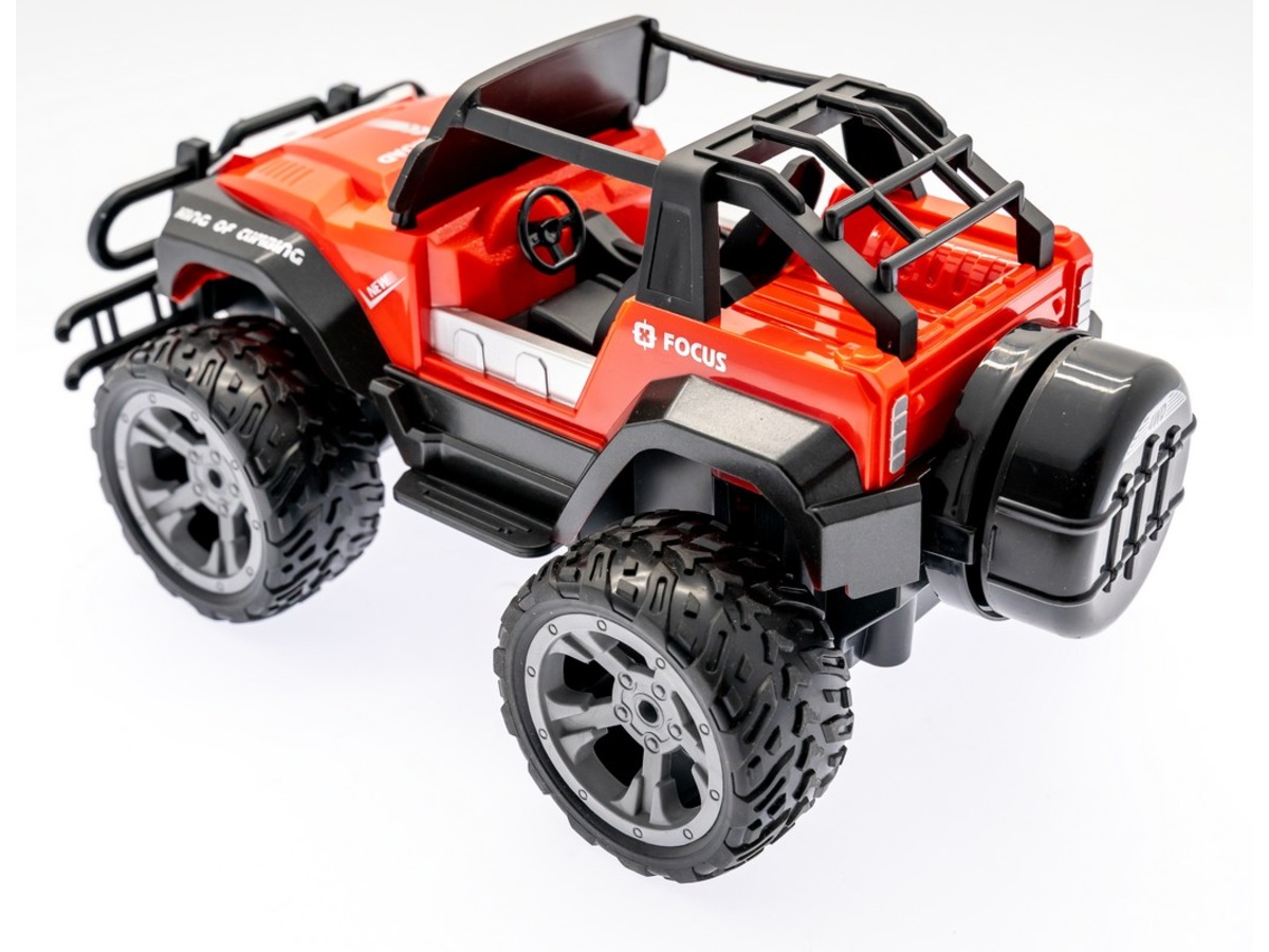 Bilen är utrustad med stora och breda hjul, som ger ett bra grepp på ojämna underlag. Den är utrustad med LED-belysning, och kommer med en fjärrkontroll med tydliga spakar och knappar.
