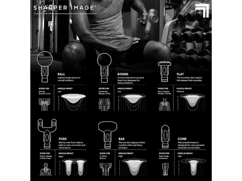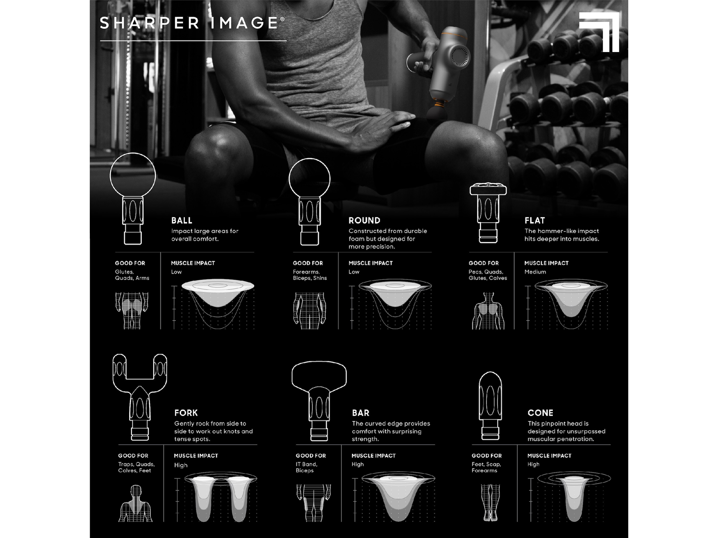 De bästa massagepistoler kan anpassas, varför vi har gjort fem utbytbara delar, fem former som täcker alla dina behov: 2 kulor, en platt, en bar, en gaffel och en kon.