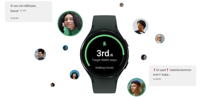Träning är ännu roligare tillsammans. Galaxy Watch4 låter dig dela varje steg – även på distans. Så nu kan du utmana och tävla ihop med dina vänner. Steg och aktivitet uppdateras i realtid; ni kan kommunicera med varandra och belönas dessutom under träningens gång, för att det ska vara både enklare och roligare att hålla igång.