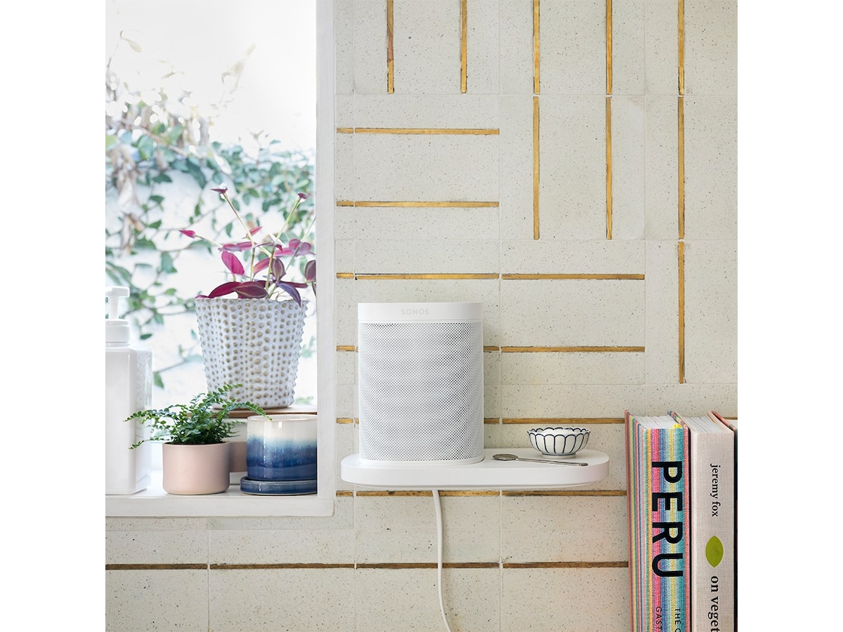Sonos One hylla Skapa ett speciellt utrymme för din högtalare med denna specialdesignade hylla. Kompatibel med: Intern lindningslösning för kabeln döljer överflödig ledning för ett elegant utseende Färgen, materialet och detaljerna är exakt matchade för att kännas som en förlängning av högtalaren Kan vridas så att högtalaren kan vändas åt vänster eller höger Installationsdelar ingår Vikt: 0,46 kg