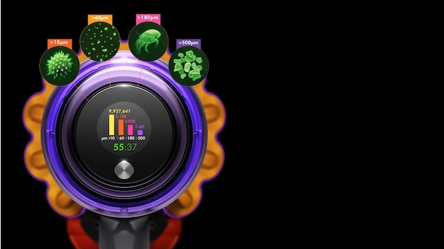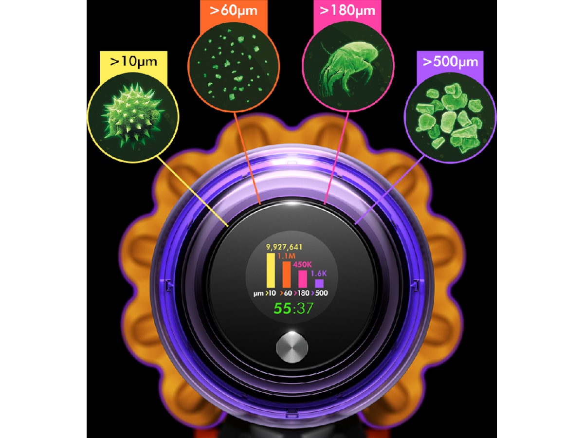 - Högst noggrannhet uppnådd i Auto mode. Automatisk rampfunktion är endast tillgänglig i Auto mode. Test baserat på genomsnittligt hemmabruk enligt Dysons interna testdata. Mikroskopiskt damm definieras som partiklar mindre än 100 mikrometer.