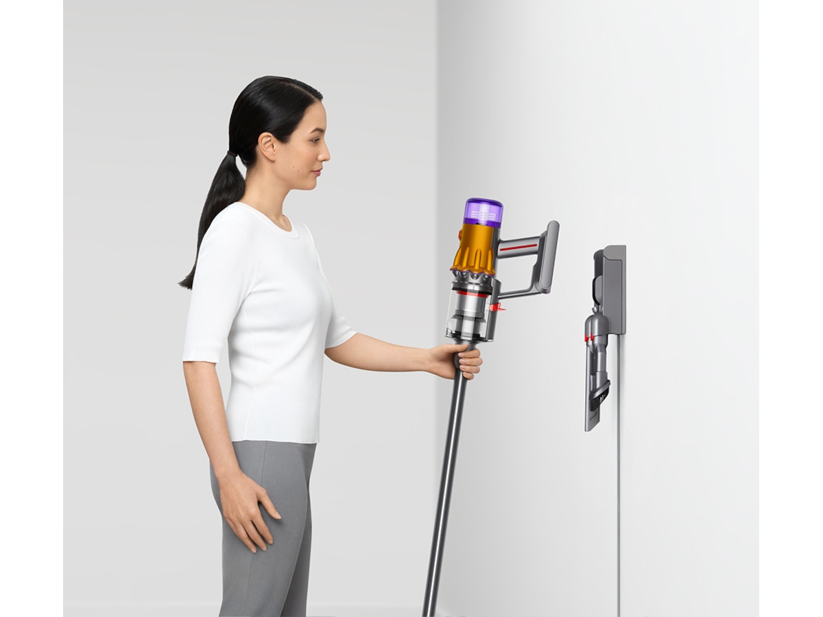 Dammsugaren Dyson V12 Slim™ placeras i den väggmonterade laddningsstationen och är sedan redo för nästa städrunda.