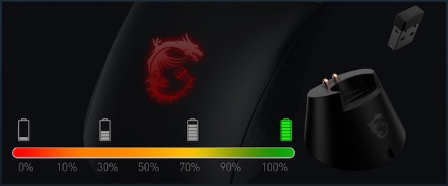 Den medföljande laddningsdockan är utformad för att bara använda en USB 2.0-port för både trådlös dongel och för att ladda musen.