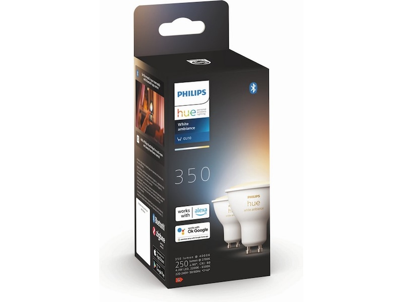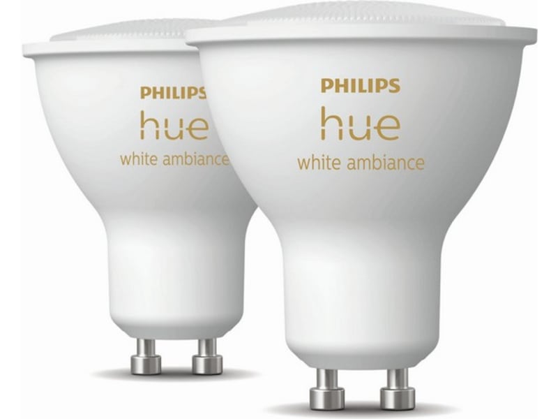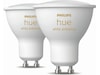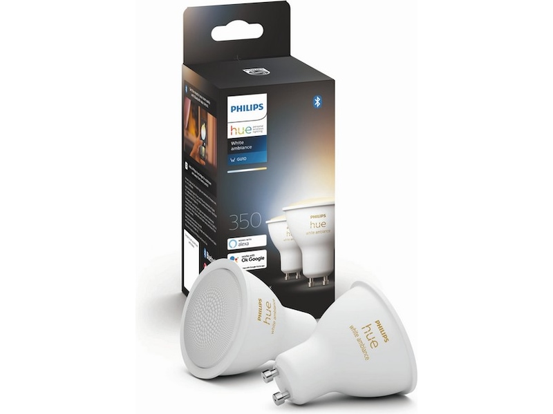 Detta paket innehåller två 5W Philips Hue White LED-ljuskällor (likvärdig 50W) med GU10-socklar, en serie av smarta lampor som låter dig dimra din belysning i både ljusstyrka (lumen) och i ljustemperatur (kelvin) så att du kan byta mellan kalla och varma nyanser av vitt ljus bnär du behöver det.