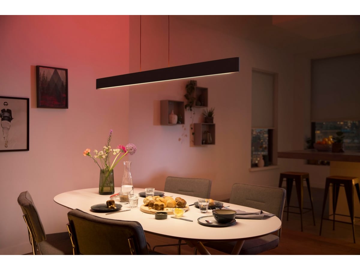 Philips Hue Ensis är en stilistisk och elegant takpendel som kombinerar belysning i full färg med en hög nivå av funktionalitet, allt i en och samma armatur.