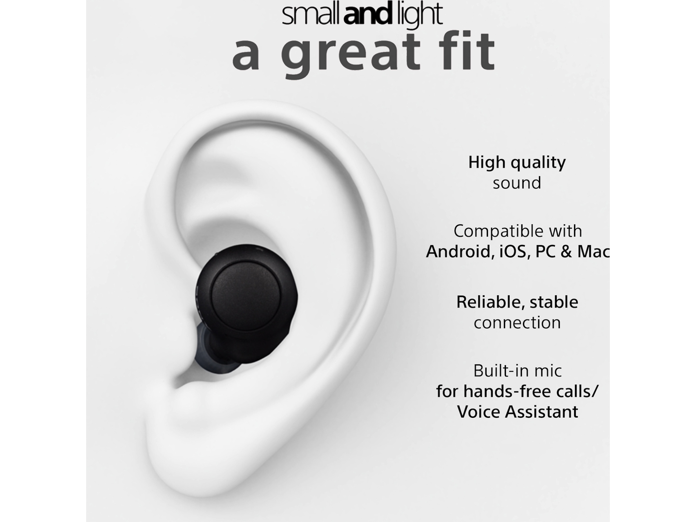 Med sin kompakta design, sitter öronsnäckorna stadigt och bekvämt i dina öron under hela dagen. Med stänktålig IPX4-klassning är hörlurarna perfekta för att användas i sportsammanhang. Den rundade formen utan kanter gör det till ett nöje att bära hörlurarna under dagarna, så att du kan fokusera på det absolut viktigaste – din musik.