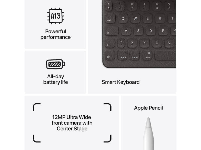 Kraftfull. Lätt att använda. Allsidig. Den nya iPaden har en fantastisk 10,2-tums Retina-skärm, ett kraftfullt A13 Bionic-chip, ultravidvinkels- och fokuserad frontkamera, och den fungerar med Apple Pencil och Smart-tangentbordet.¹