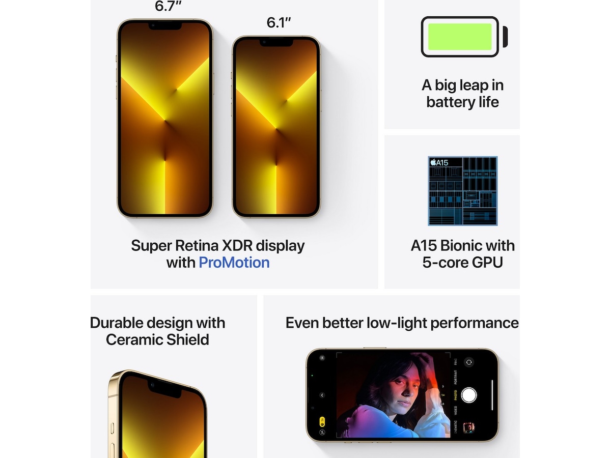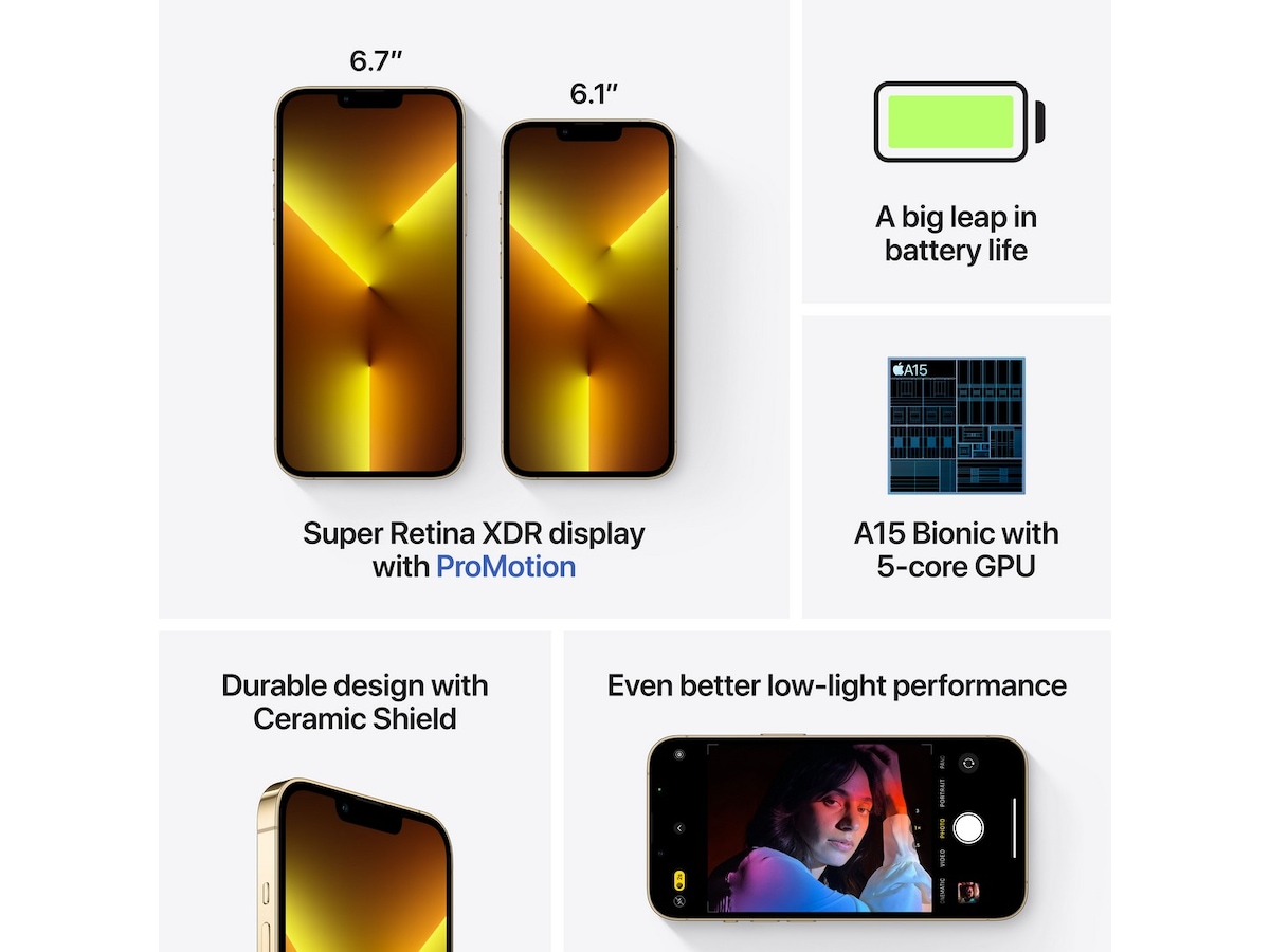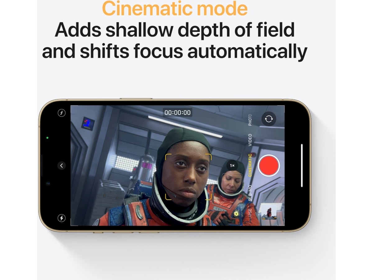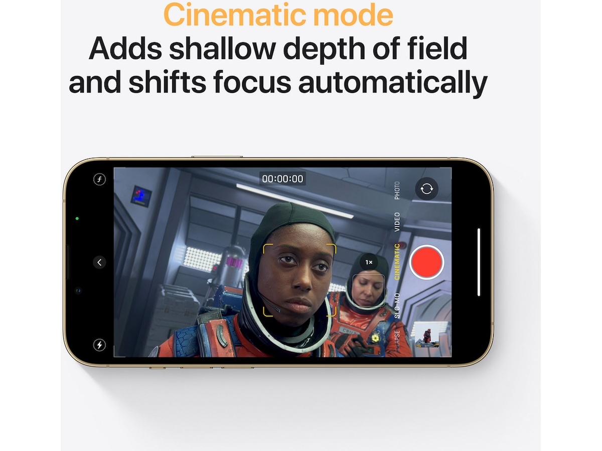 | Kameralägen | Macro-läge, Nattläge, Serieläge, Stående belysning, Panorama, Vidvinkeltagning i färg för bilder och Live-bilder, Bioläge, Apple ProRAW, Live-foton, Porträttläge med avancerad bokeh och djupkontroll, Tidsfördröjning (nattläge) |