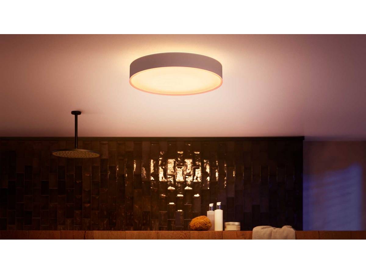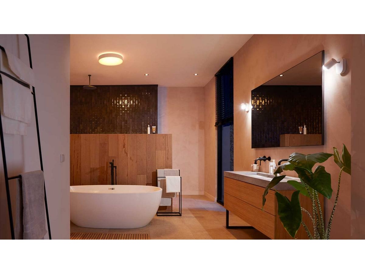 Den utger ett kraftigt men jämt ljus som täcker en större yta medan den även skapar en slät, len ljuseffekt på taket. Med White ambiance kan du välja mellan kalla och varma toner av vitt ljus så att du kan ställa in den perfekta stämningen för varje stund i vardagen. Låt det klara ljuset pigga upp dig på morgonen eller dimra ner och lägg på varmare toner av vitt ljus för en avslappnad söndagskväll i badkaret.