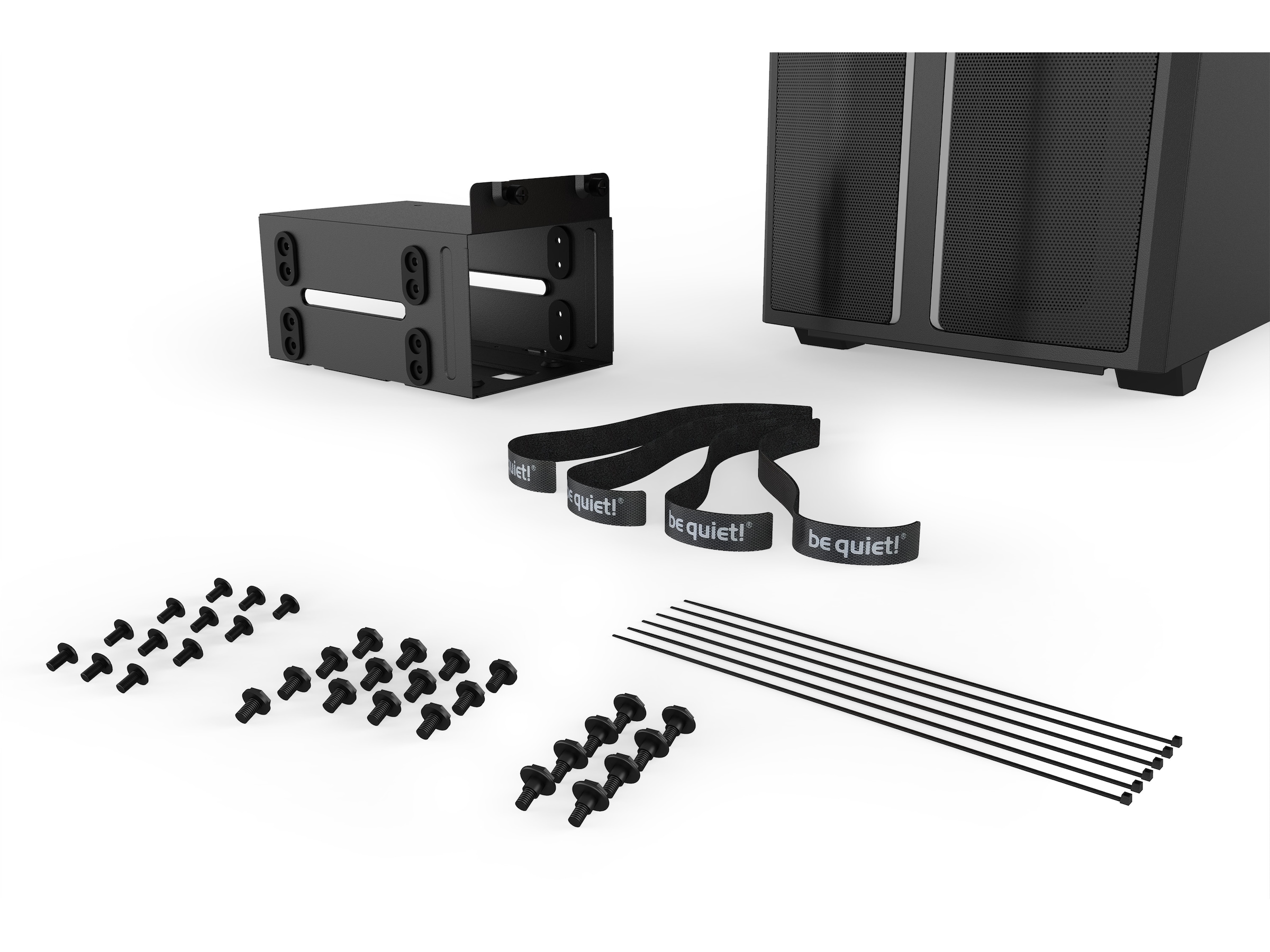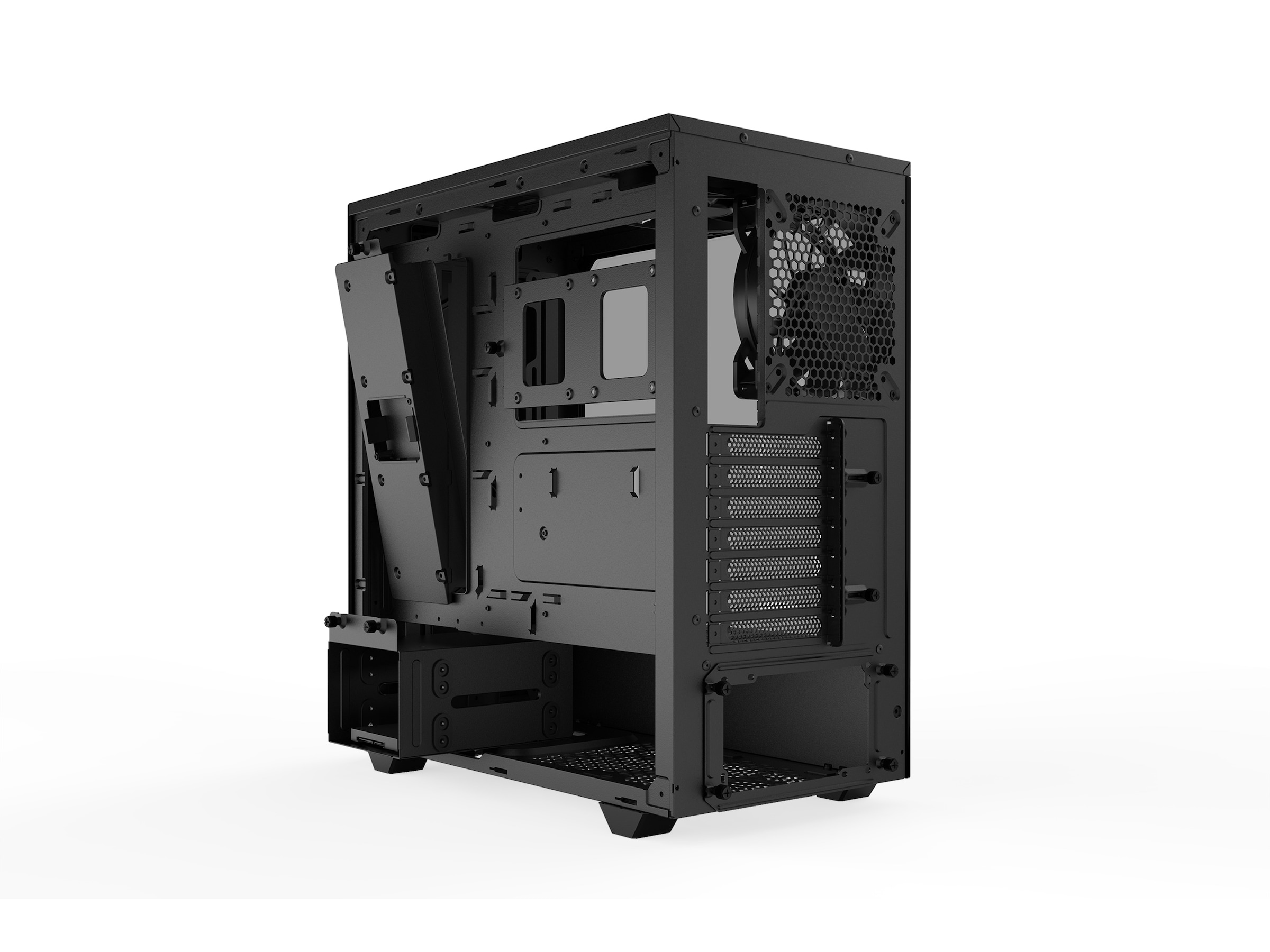 PSU-duken täcker perfekt kablarna och PSU:n. Den innehåller också en dubbel HDD-bur med avkopplade monteringar som minskar vibrationer och hjälper till att maximera tystnaden. Buren kan också flyttas för att installera en radiator på upp till 360 mm framtill. Strömförsörjningsenheten kan enkelt installeras bakifrån, monterad på den medföljande PSU-fästen.