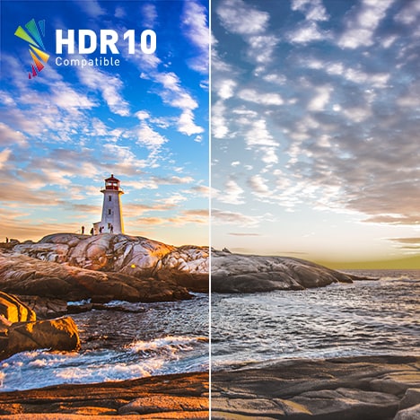 Mer realistiska, naturliga bilder fås genom ett utökat kontrastförhållande och en färgpalett med HDR10-kompatibelt. HDR (high dynamic range) är en skärmteknik som skapar djupare nivåer av konstrasten mellan svart och vit med hjälp av skalär kretsavkodning och kartläggningsteknik för en större nivå av fördjupning vid realistisk bildrekreation.
