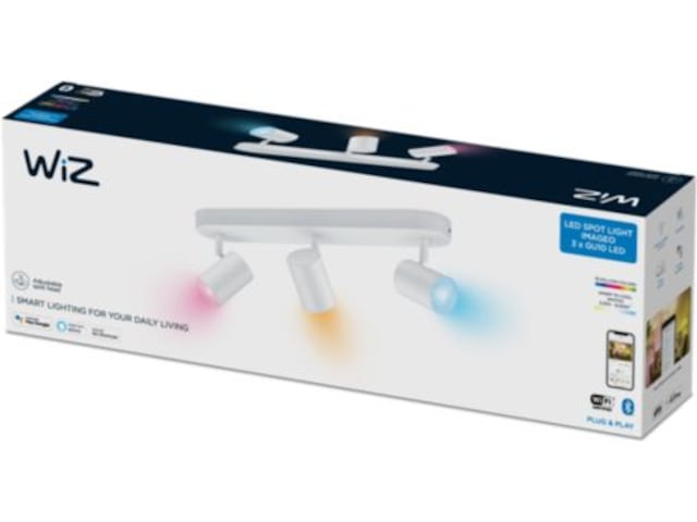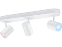 Använd de tre justerbara spottarna och det färgglada smarta ljuset för att skapa stämning i alla rum med WiZ Imageo smart påbyggd spotlight i svart. Använd med ditt befintliga Wi-Fi för att styra med WiZ-appen eller din röst.