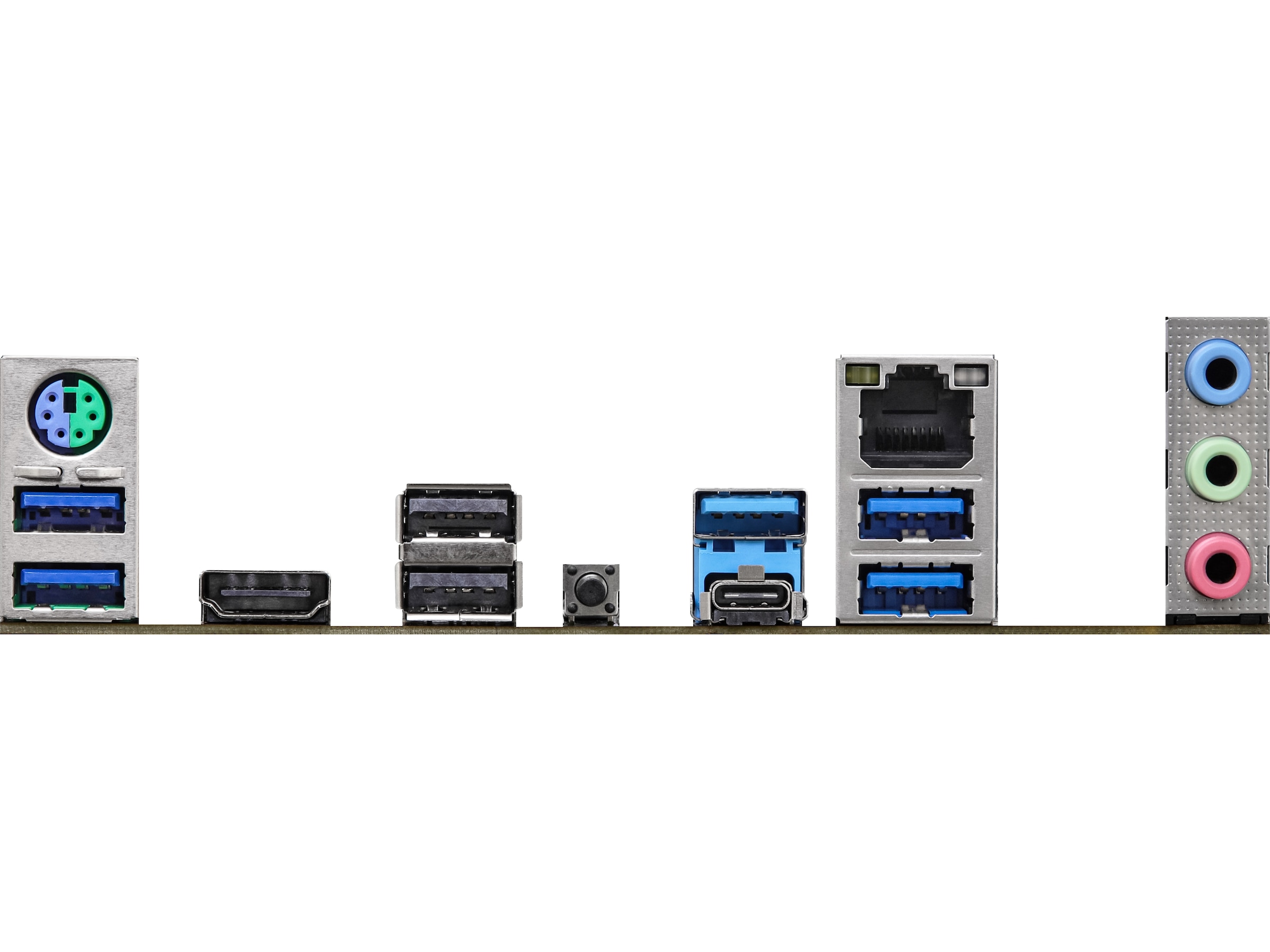 1 x mikrofon - mini-jack, 1 x ljudutgång - mini-jack, 1 x HDMI, 2 x USB 2.0, 1 x USB 3.2 Gen 2, 1 x USB-C Gen2, 1 x ljudingång - mini-jack, 4 x USB 3.2 Gen 1, 1 x LAN (Gigabit Ethernet), 1 x PS/2-tangentbord/mus