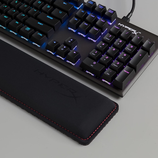 HyperX™ Wrist Rest (handledsstödet) ger ett bekvämt, vadderat stöd för handlederna för alla som använder normala stora tangentbord när de spelar. Det har en halkfri undersida av naturgummi som håller stödet stilla medan fingrarna flyger över tangenterna. HyperX-handledsstödet är slitstarkt och högkvalitativt tack vare sömmar som förhindrar uppfranskning så att man bekvämt kan köra på spelsession efter spelsession.