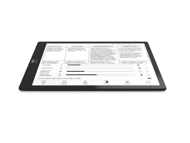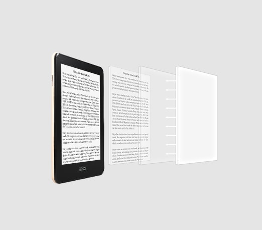 13,3” E Ink Mobius Carta-skärmen med SNOW Field-funktionen är idealisk för att visa dokument som innehåller grafer och diagram, såväl som för alla PDF- eller DjVu-dokument. Frånvaron av flimrande bakgrundsbelysning och principen om bildbildning med "elektroniskt bläck"-metoden gör läsningen bekväm för ögonen. Skärmen är ungefär lika stor som ett A4-ark och låter dig se även enkla skannade sidor utan att zooma in dem.