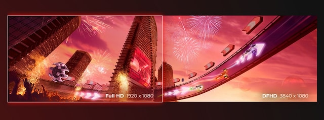 Med en storlek på 49 tum ger ultrabreda skärmar dubbelt så stort skärmutrymme jämfört med vanliga skärmar. Den extra storleken möjliggör en mer effektiv användning av utrymmet och ett aldrig tidigare skådat 32:9-förhållande.