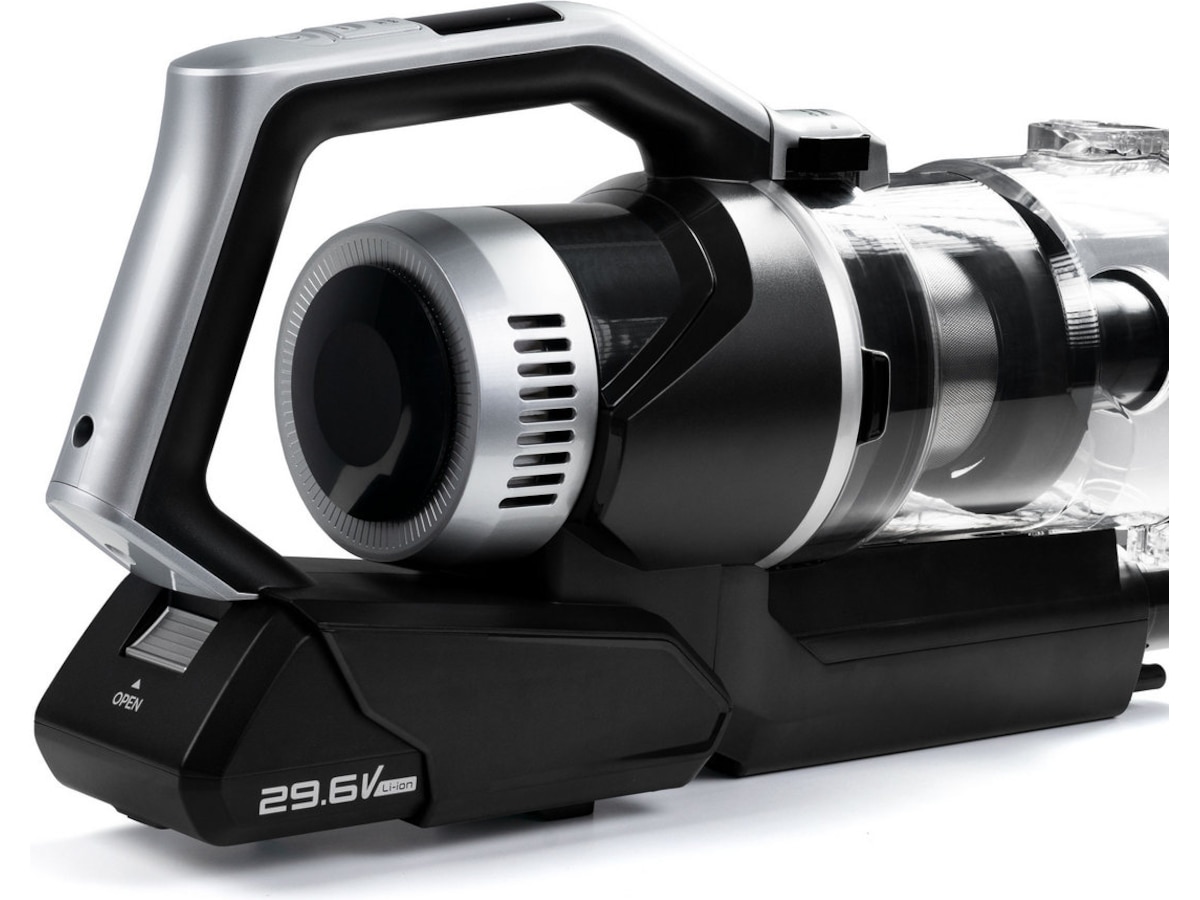 Den trådlösa dammsugaren med sitt 64 cm långa skaft är idealisk för dammsugning på större ytor, medan den mindre avtagbara handdammsugaren är perfekt för rengöring av möbler eller bilens interiör.