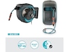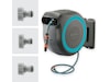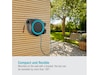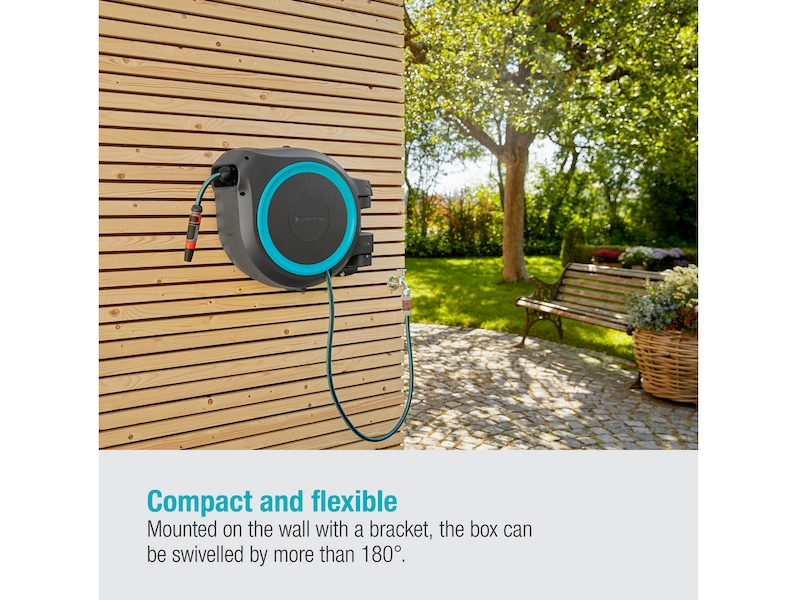 Tack vare det praktiska väggfästet kan slanglådan vridas i en vinkel på 180°. Detta gör att du kan vattna varje hörn av din trädgård flexibelt och utan att böja slangen. Efter användning kan den kompakta lådan skjutas åt sidan på väggen för att spara utrymme.