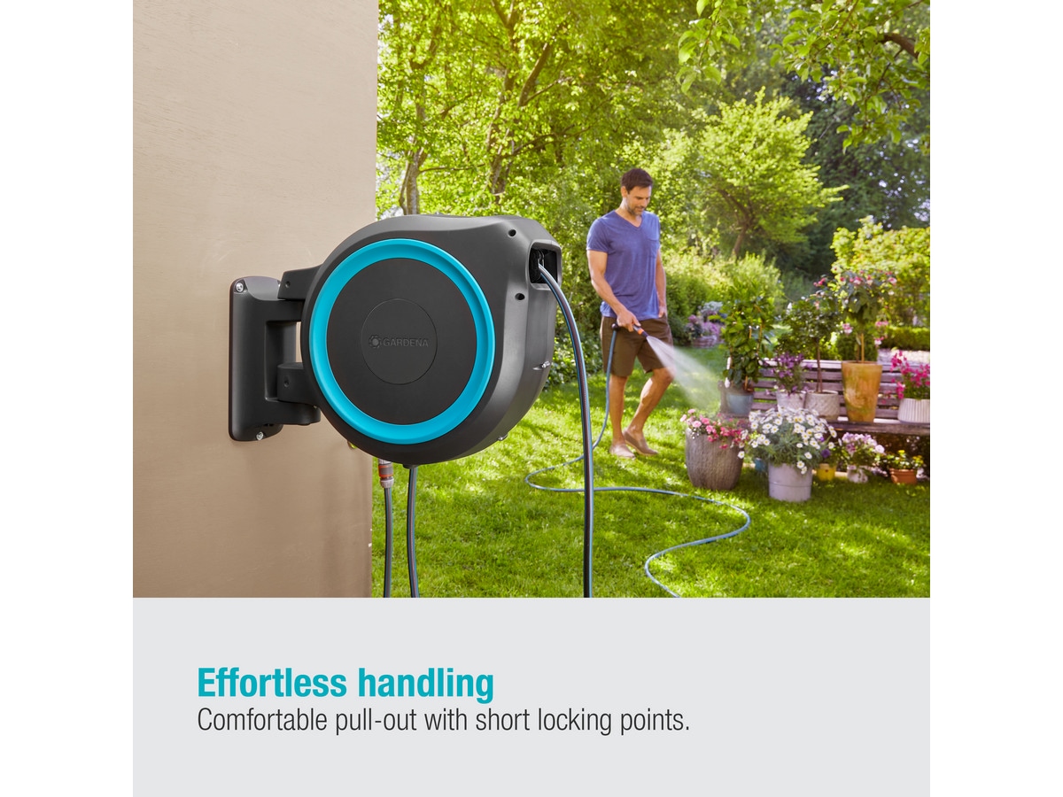 Med ett lätt drag i änden av slangen aktiveras den integrerade stålfjädern och lindar tillbaka slangen automatiskt och tillförlitligt. RollControl-tekniken säkerställer långsam och säker indragning, oavsett hur långt slangen rullas ut.