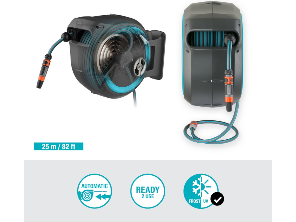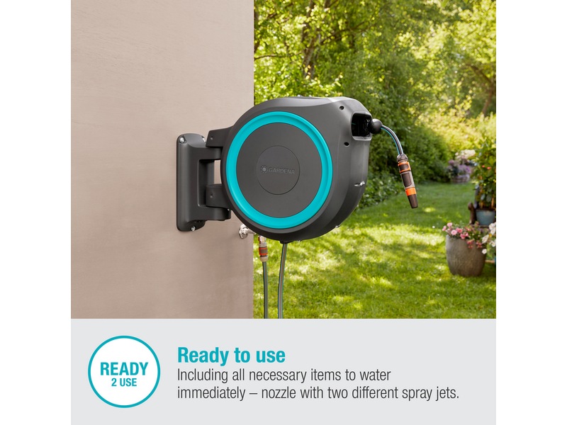Den väggmonterade RollUp XL-slanglådan levereras med ett väggfäste, en 25 meter vattenslang, en anslutningsslang, alla nödvändiga GARDENA-systemdelar och ett munstycke med två olika spraystrålar.