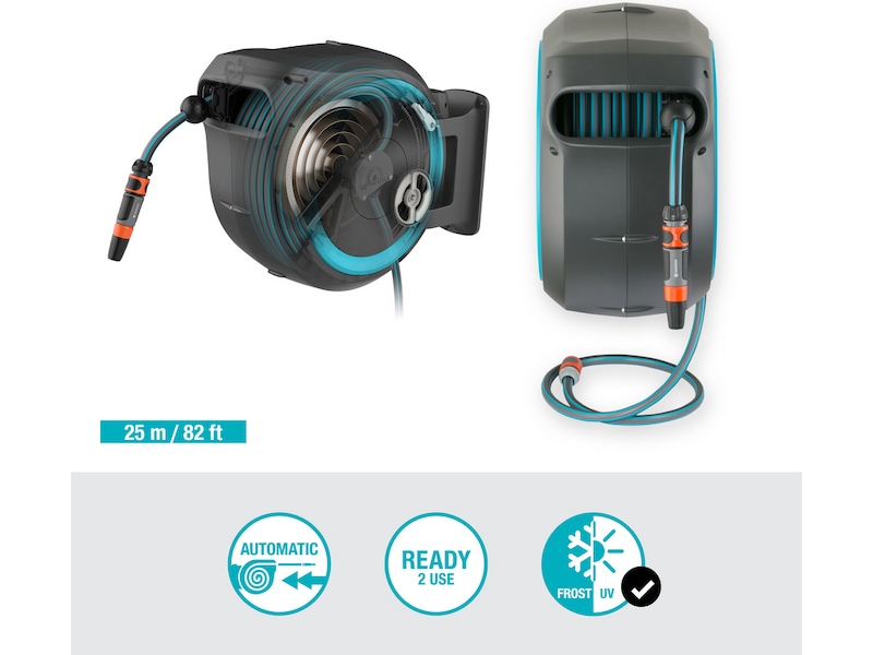 Den högkvalitativa stålfjädern inuti lådan rullar upp slangen automatiskt, tillförlitligt och jämnt. Innovativ RollControl-teknik ger säker och kontrollerad indragning.