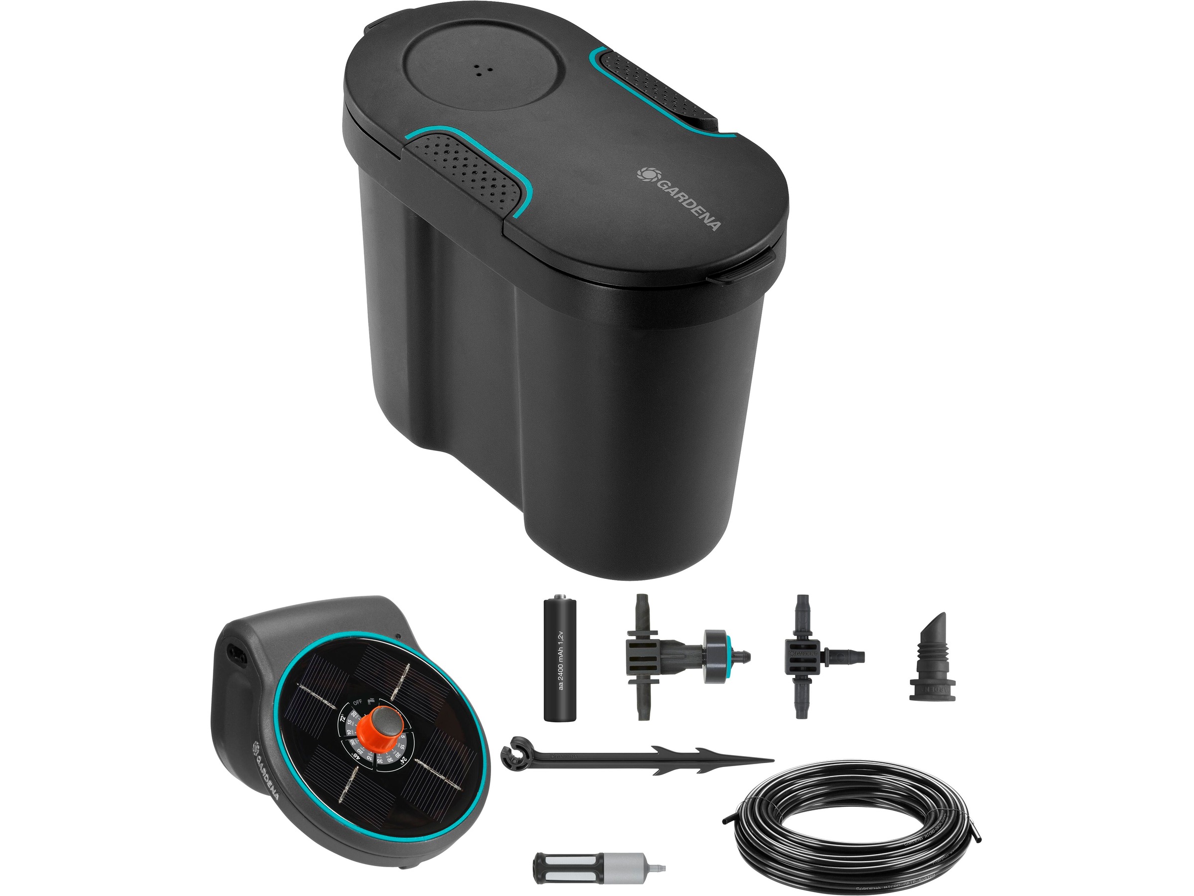 Det soldrivna bevattningssetet med vattentank kräver ingen strömanslutning. Kombinationen av en solpanel och uppladdningsbara batterier garanterar pålitlig vattning under hela säsongen.