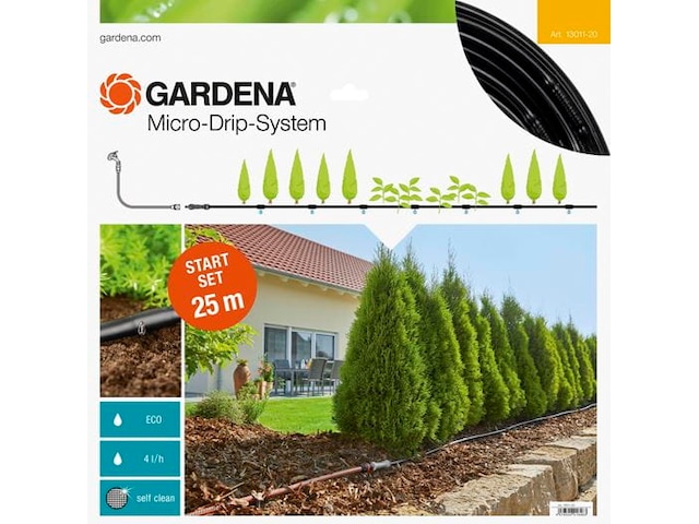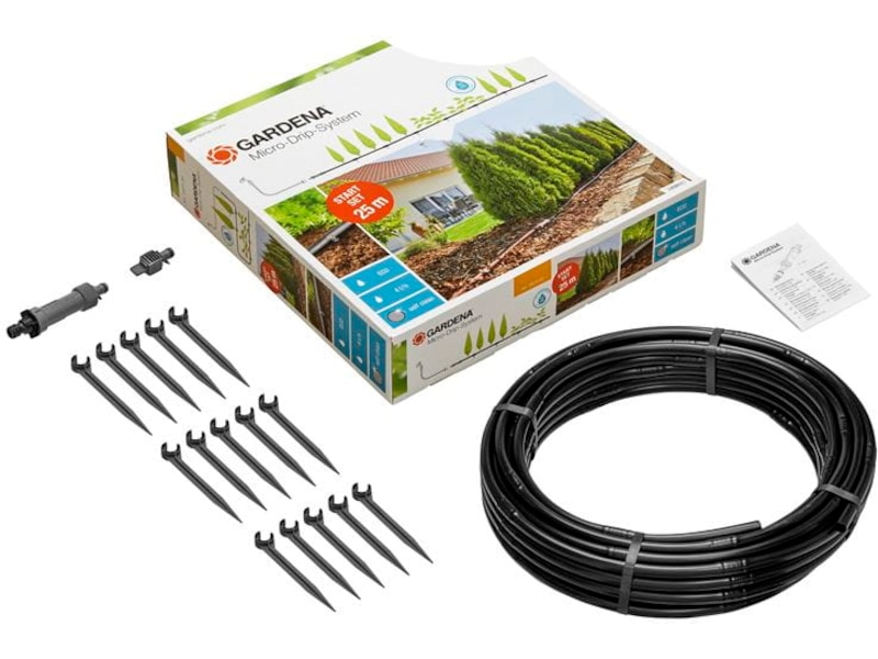 GARDENA Micro-Drip-System startset för växtrader används för praktisk och vattenbesparande rotbevattning av växtrader. Huvudenheten med tryckreducering ansluts till kranen med hjälp av en slang. Droppbevattningslinjen är utrustad med självrengörande dropphuvuden på 30 cm avstånd, och ger därmed jämn bevattning av bäddar och växtrader.
