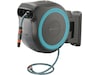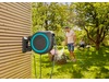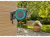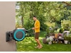 Tack vare det praktiska väggfästet kan slanglådan vridas i en vinkel på 180°. Detta gör att du kan vattna varje hörn av din trädgård flexibelt och utan att böja slangen. Efter användning kan den kompakta lådan skjutas åt sidan på väggen för att spara utrymme.