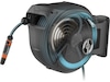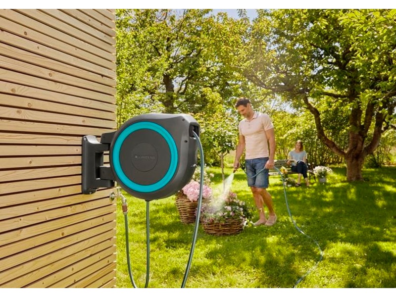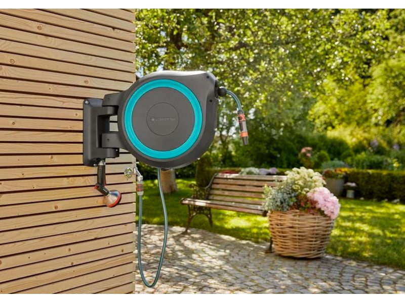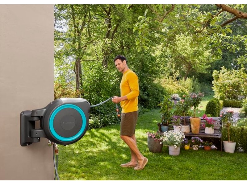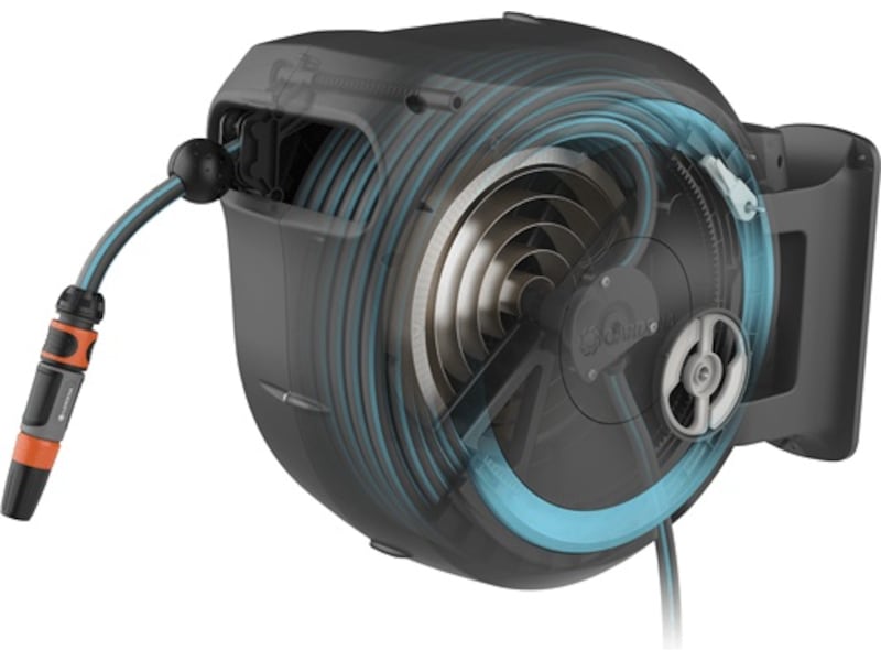 Den innovativa RollControl-teknologin gör indragningen både säker och kontrollerad. Den integrerade slangstyrningen ser till att slangen rullas upp snyggt och jämnt, utan trassel. Kranen och slanganslutningarna på slanglådan är en del av det ursprungliga GARDENA-systemet, så du kan när som helst ansluta andra bevattningstillbehör från GARDENA. Munstycket från GARDENA är alltid lättillgängligt. Den kan fästas under väggfästet och förvaras där för att spara utrymme.
