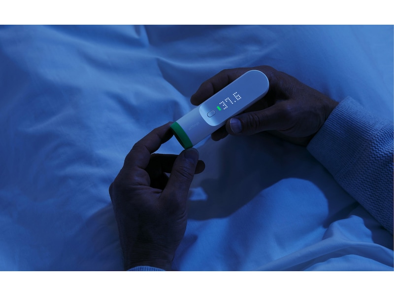 Siffrorna från mätningen lyser på enheten tillsammans med en färgkodad LED-indikator som visar om temperaturen är normal, förhöjd eller hög baserat på användarens ålder.
