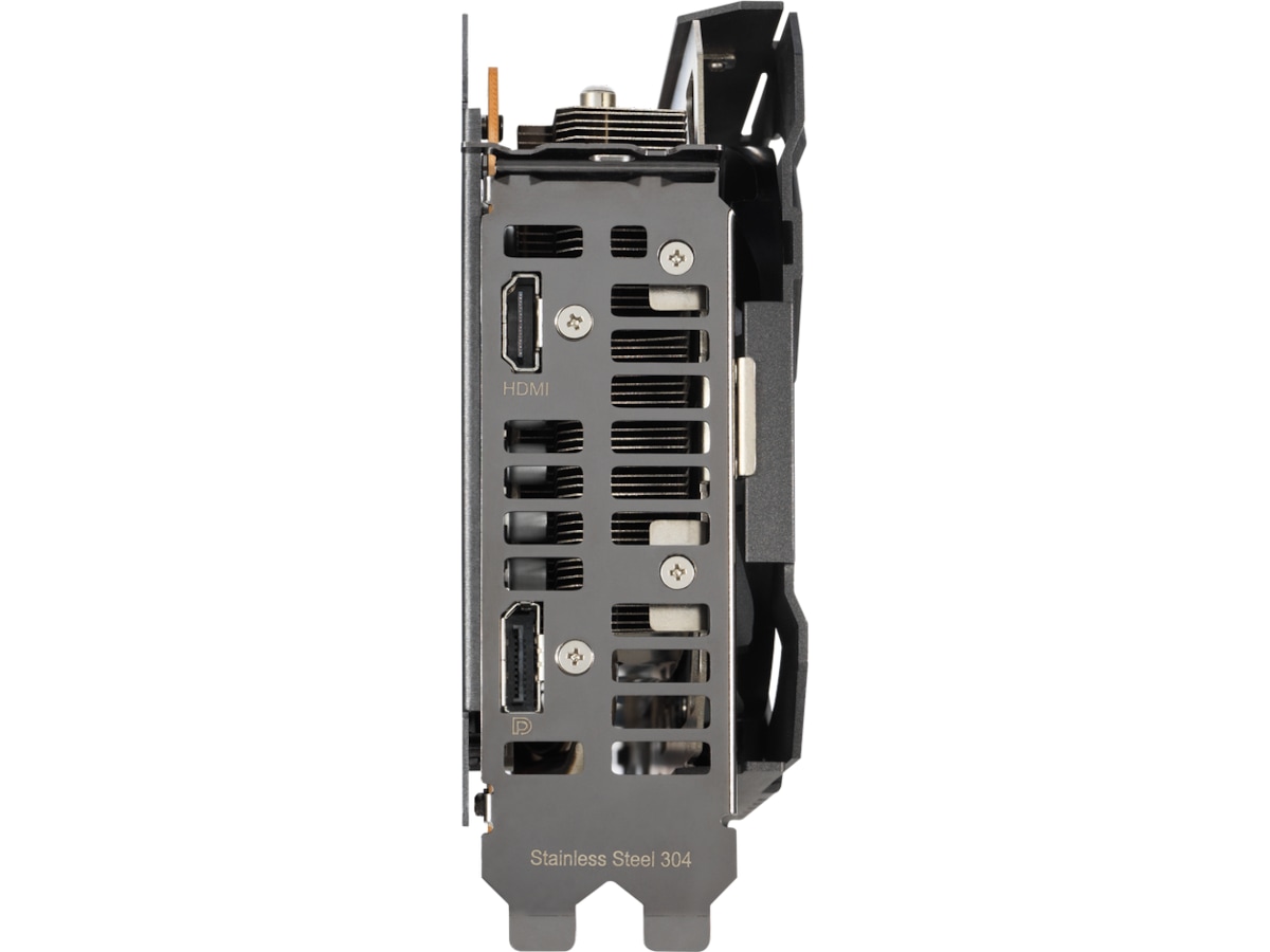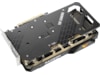 Undersidan av kortet avslöjar ytterligare förbättringar. Det mesta av baksidan består av en skyddande metallplatta som framträdande har en bred ventilering. Ventilationen låter varm luft avledas mot chassits avgasfläktar istället för att återvinnas tillbaka till GPU-kylaren. Rostfritt stål används för I/O-fästet för att skydda portarna och ge ett säkrare fäste. Och en bekvämt placerad Dual Bios-omkopplare gör det möjligt att anpassa kortets standardprestanda-profil utan programvara.