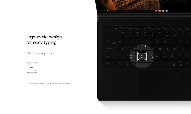 Med Book Cover Keyboard är det mycket lättare att få saker gjorda. En större styrplatta på tangentbordet ger dig en sömlös upplevelse. Och med DeX arbetar du som på en PC med ett enda tryck. Dessutom kan surfplattan användas i alla ljusförhållanden med 3-stegs justerbar bakgrundsbelysning på tangentbordet.