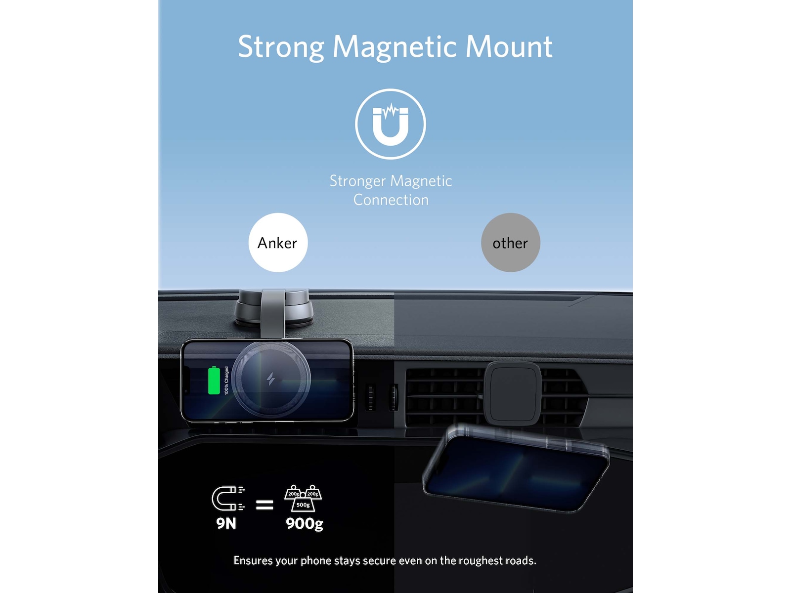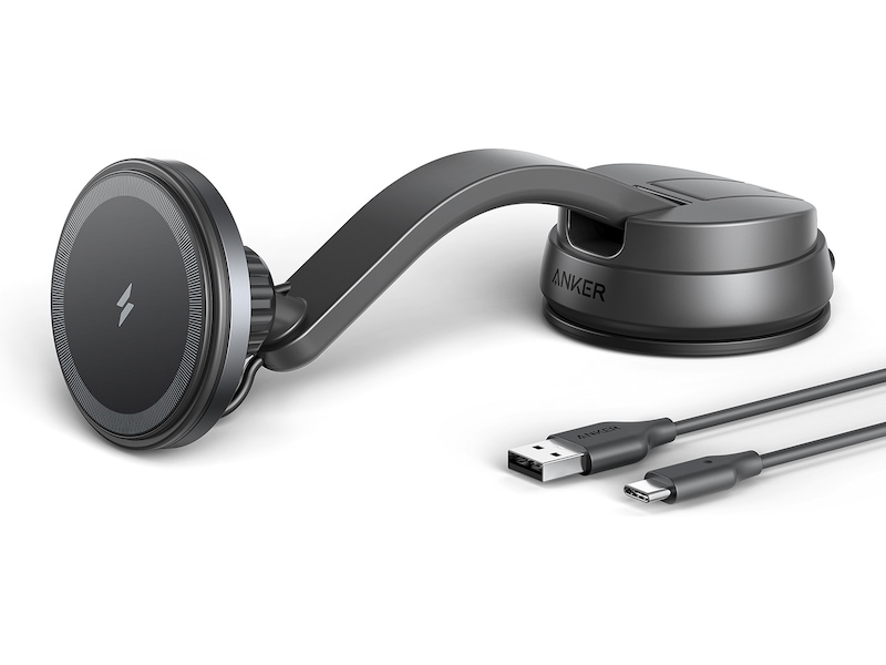Anker 613 Magnetic Wireless Charger (MagGo), USB-billaddare med 2 portar, 1,5 m USB-C- till USB-A-laddningskabel, 4 kabelklämmor (självhäftande) och monteringsplatta för instrumentbrädan (3M).