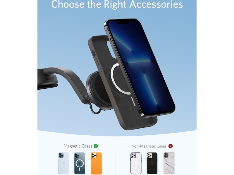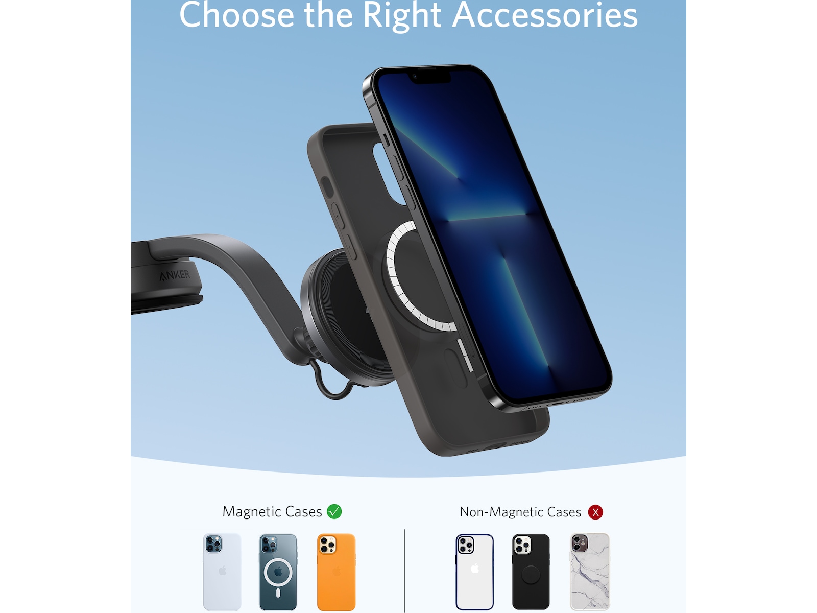 Inte kompatibelt med icke-magnetiska telefonfodral, såsom OtterBox försvarsfodral. Fodral av metall och tillbehör som magneter, kort, nycklar och popgrepp stör laddningen.