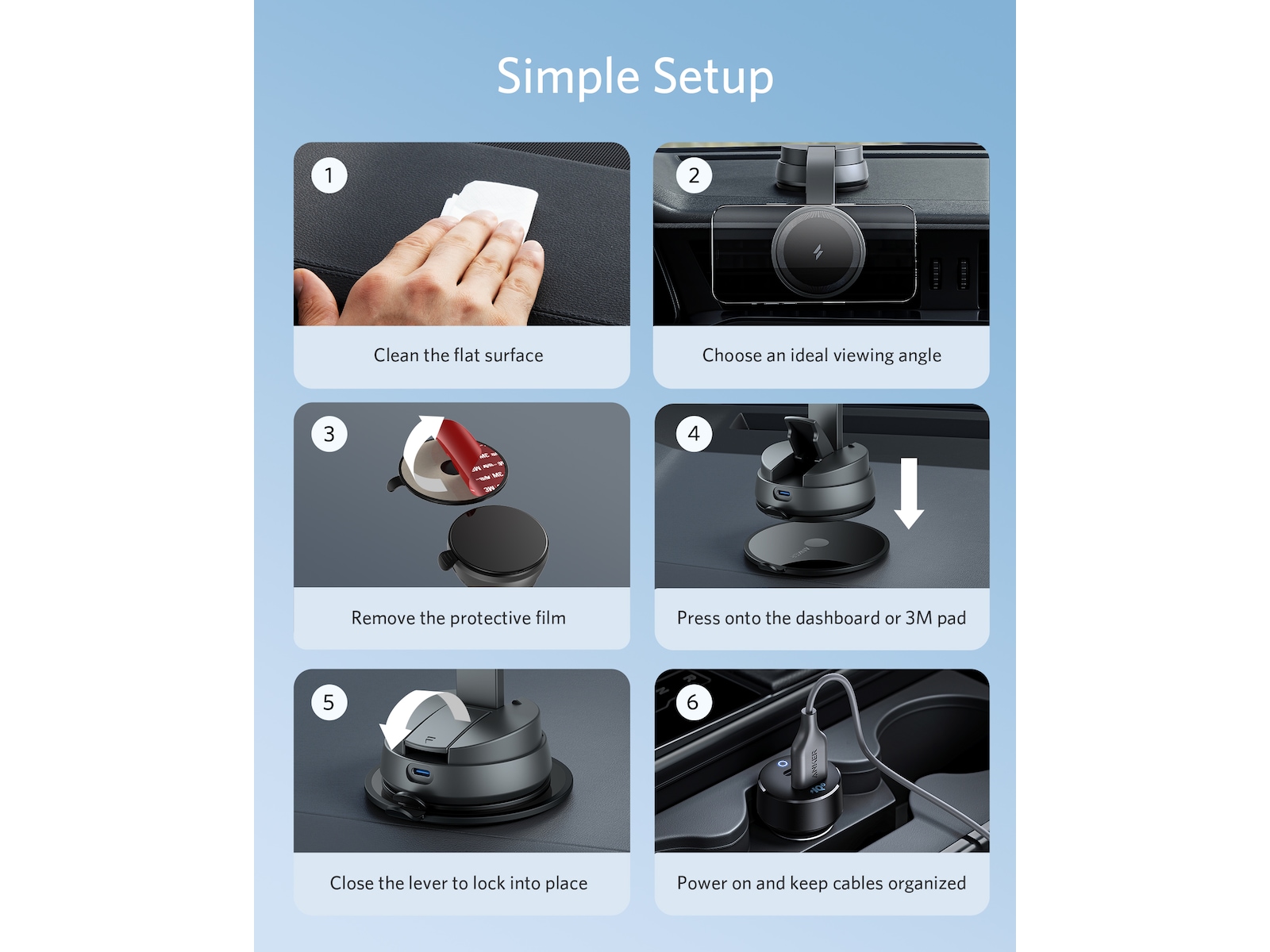 • Vad du får:Anker613Magnetisk trådlös laddare (MagGo), USB-billaddare med 2 portar, 1,5 m USB-C- till USB-A-laddningskabel, 4 kabelklämmor (självhäftande), monteringsplatta (3M), välkomstguide, 24 månaders stressfri garanti och vänlig kundservice.